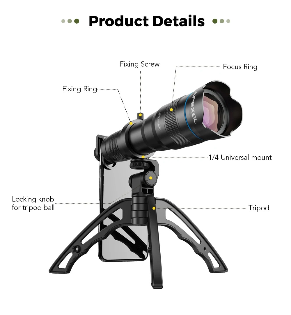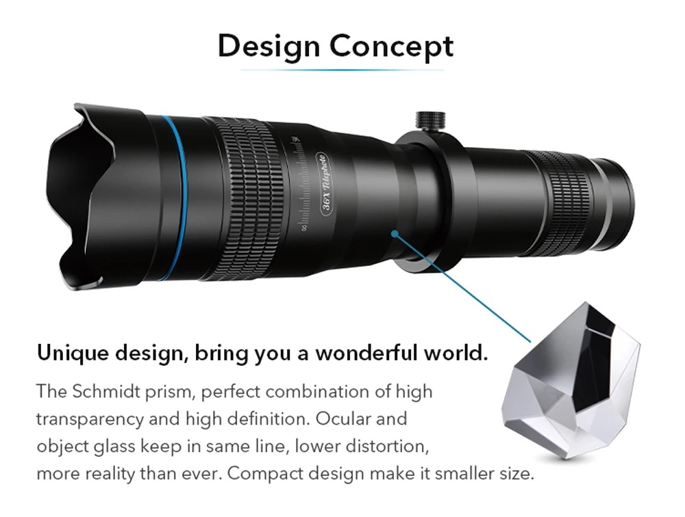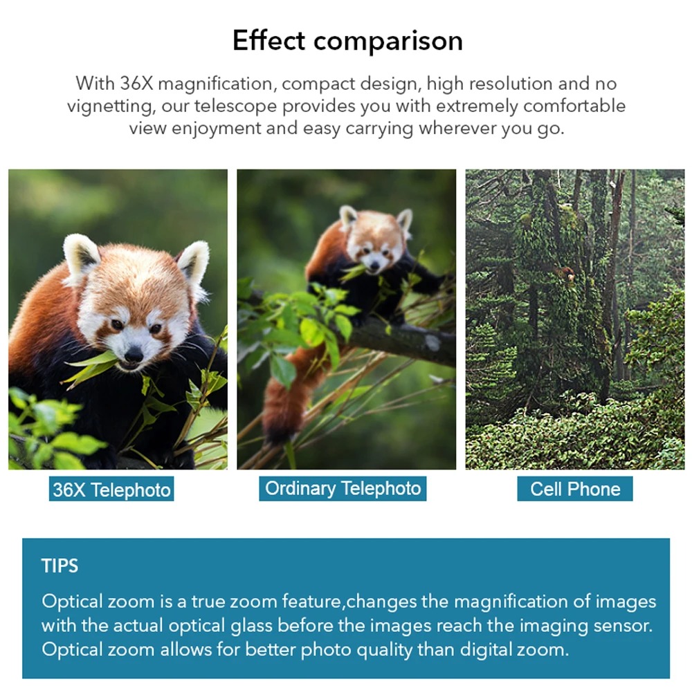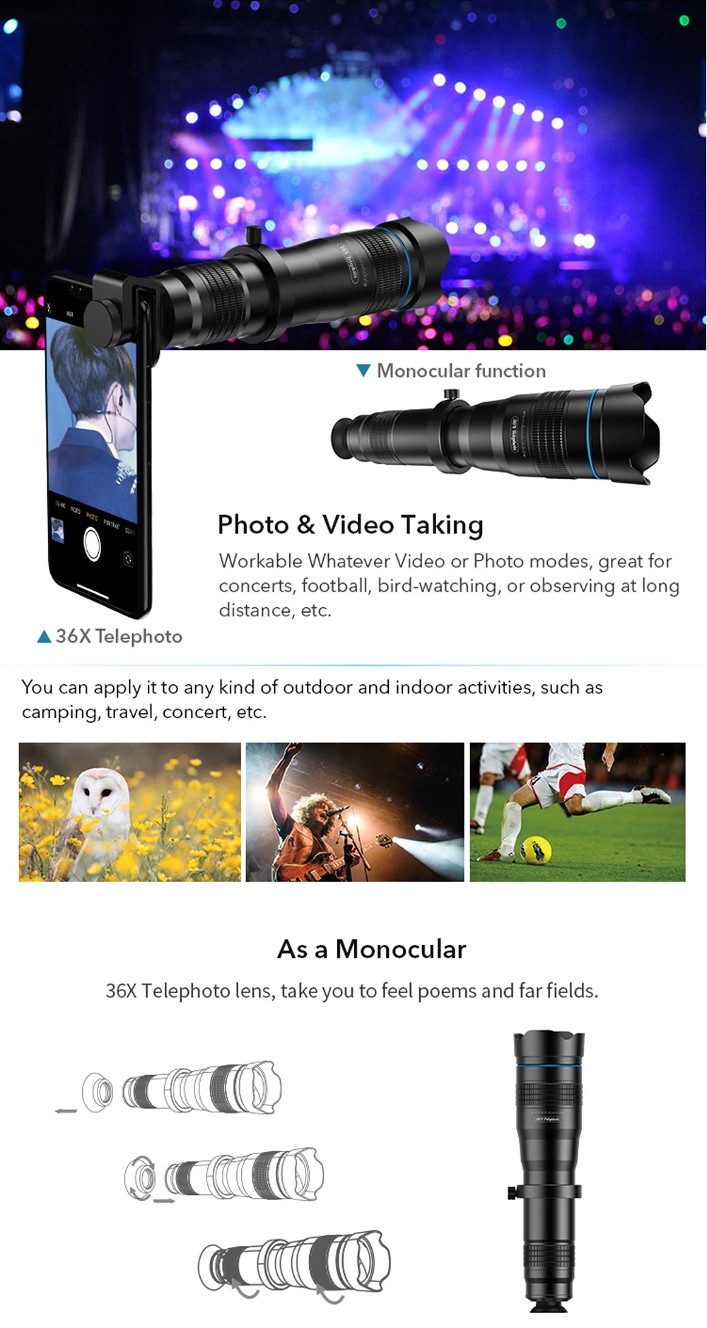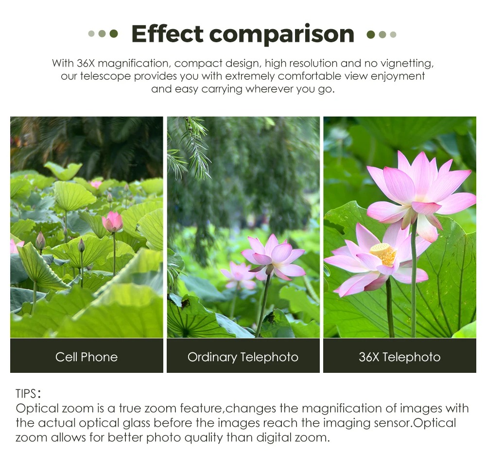 - Đây là một mới thiết kế quang học chất lượng cao 36X Kính thiên văn Zoom ống kính với chân máy mini, đáp ứng các nhu cầu khác nhau của nhiếp ảnh.
