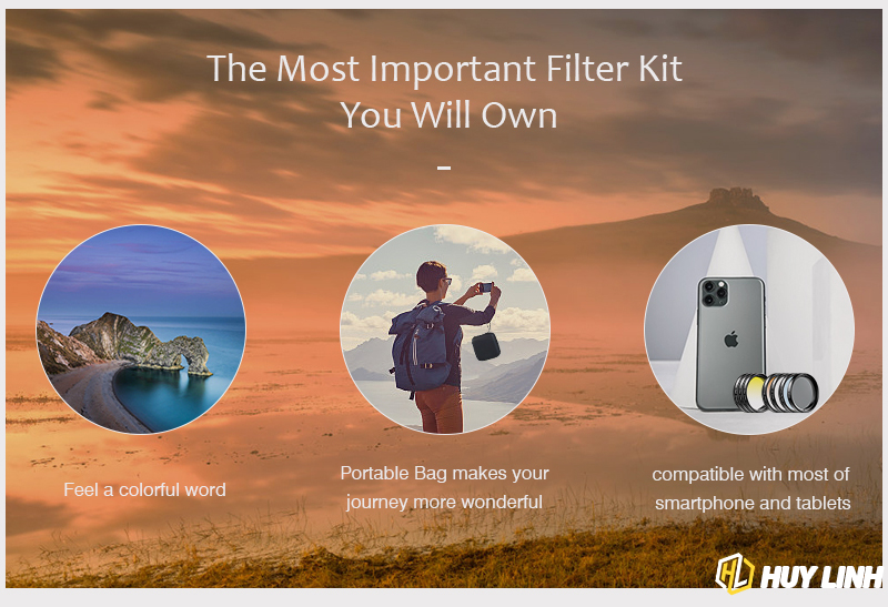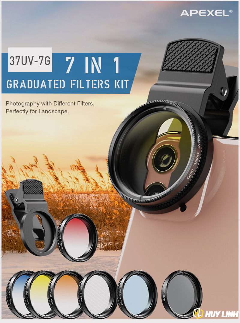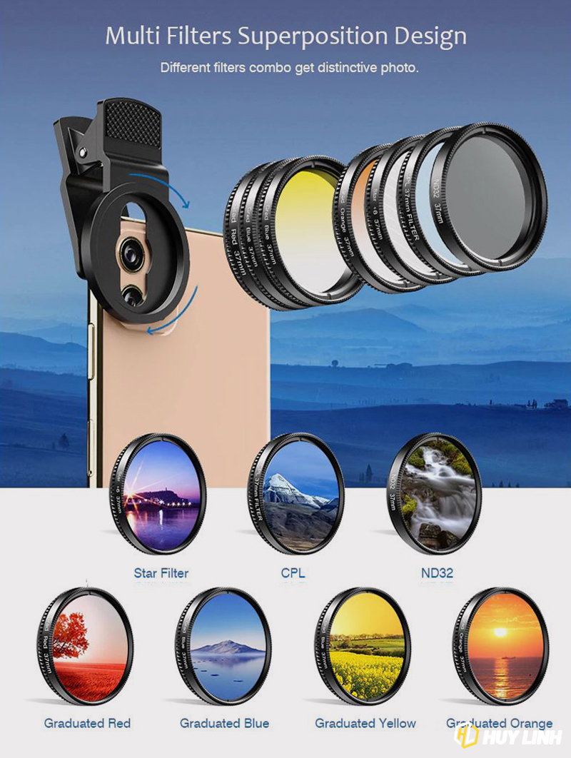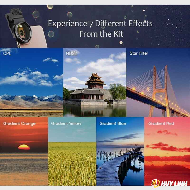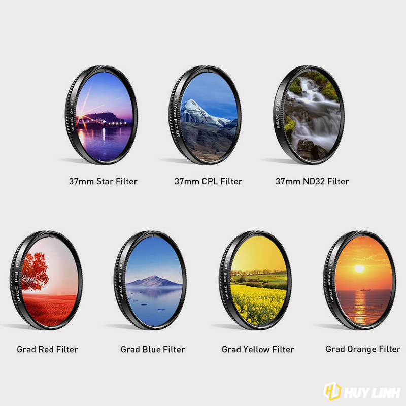 - Đây là một sản phẩm thiết kế chuyên nghiệp đạp ứng đầy đủ nhu cầu chụp ảnh khác nhau của người dùng với 0.45X góc rộng, macro 15X, Bộ kính lọc màu Đỏ/Vàng/Cam/Xanh Dương, CPL, ND32 và Ngôi Sao trong cùng một bộ.