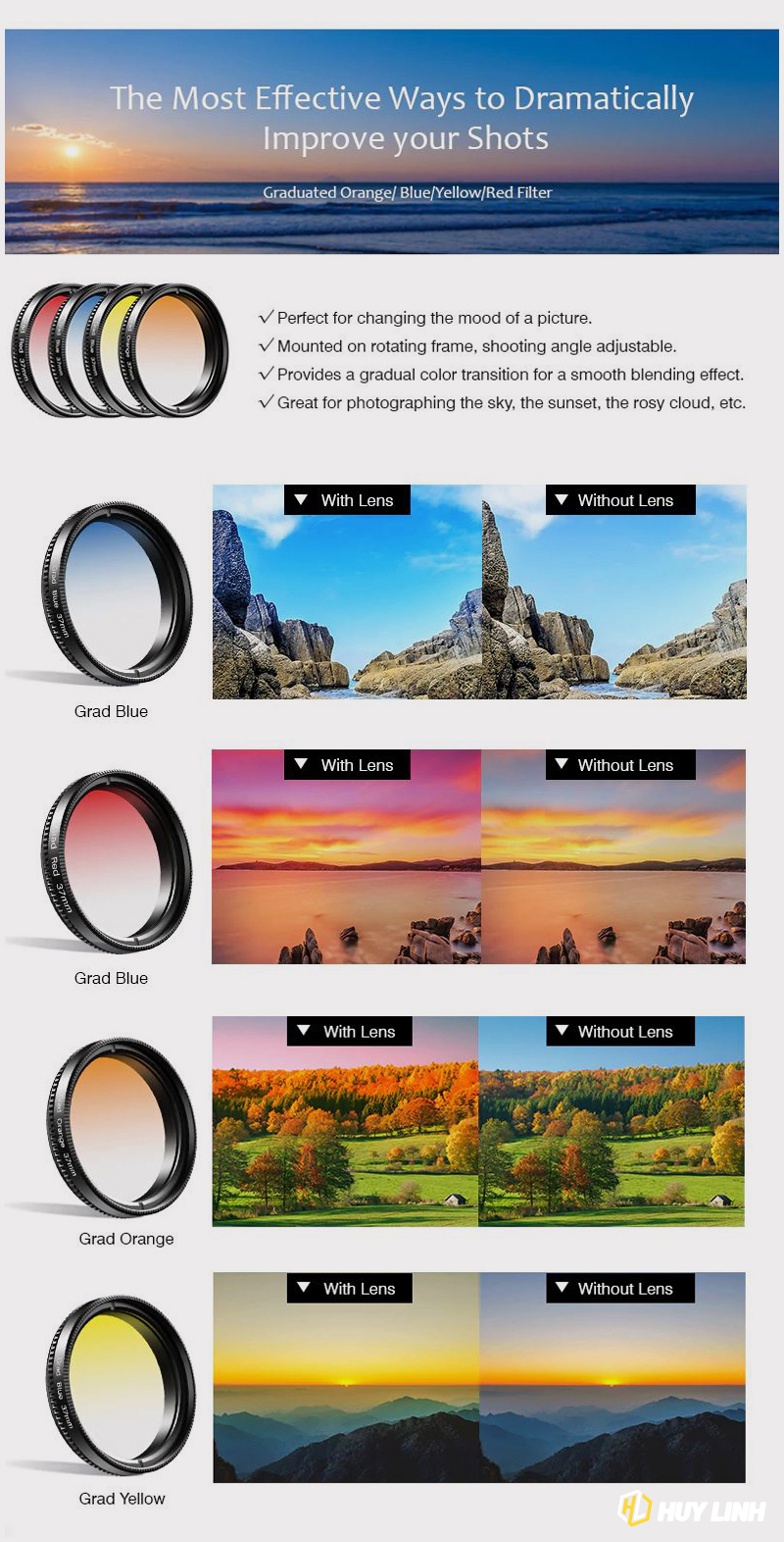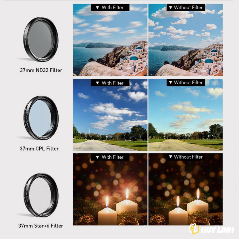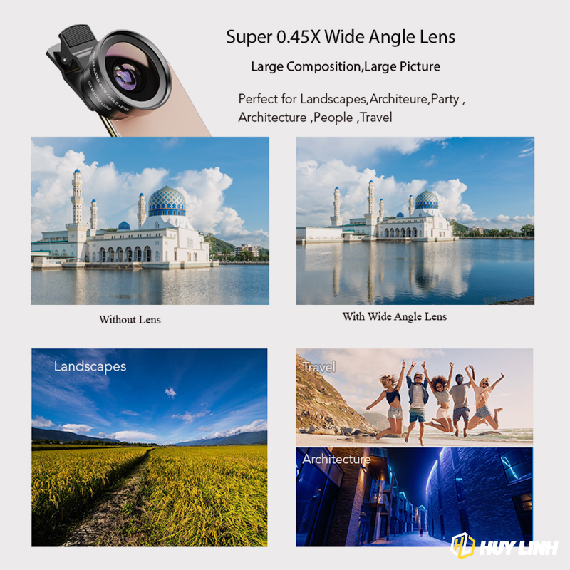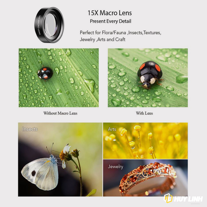 - Đây là một sản phẩm thiết kế chuyên nghiệp đạp ứng đầy đủ nhu cầu chụp ảnh khác nhau của người dùng với 0.45X góc rộng, macro 15X, Bộ kính lọc màu Đỏ/Vàng/Cam/Xanh Dương, CPL, ND32 và Ngôi Sao trong cùng một bộ.