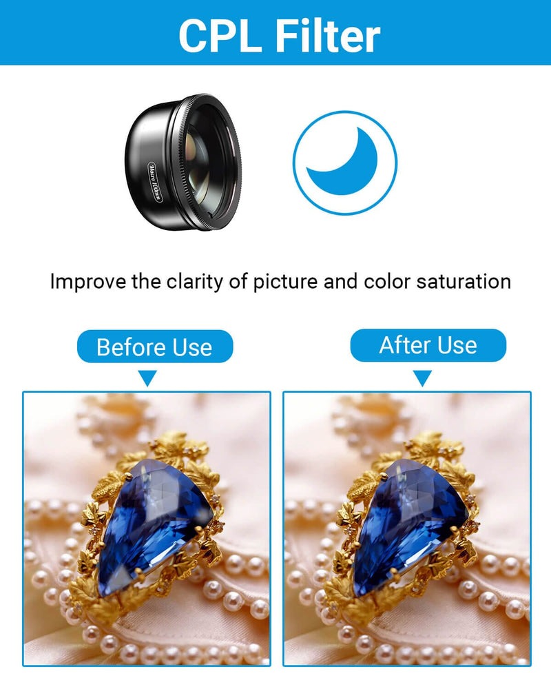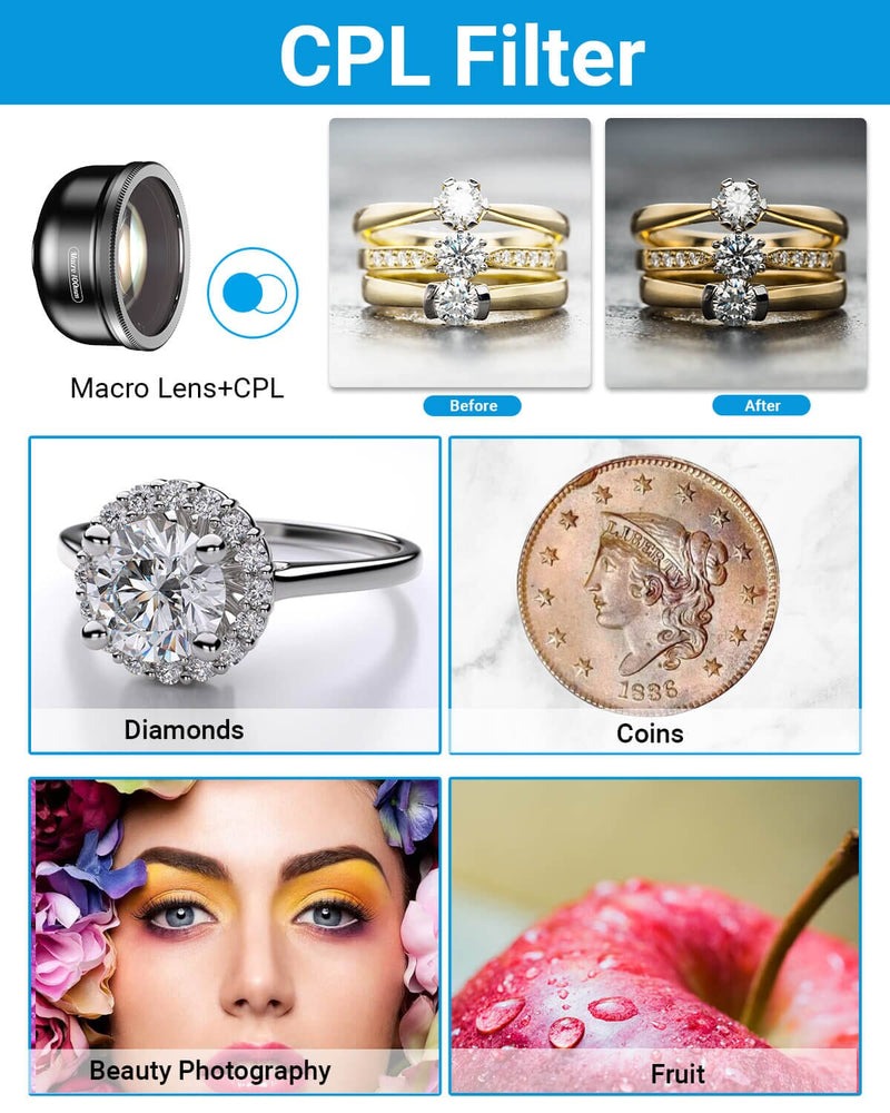 - Ống kính macro điện thoại di động APEXEL đi kèm với một bộ lọc CPL có thể gắn trực tiếp vào ống kính điện thoại bằng ren 37mm. Bộ lọc này giúp giảm thiểu phản xạ ánh sáng đi lạc, tăng cường độ bão hòa màu và cho phép bạn chụp ảnh sắc nét. Thiết bị duy nhất bạn cần là một chiếc điện thoại có ống kính macro dành cho điện thoại thông minh để bạn có thể chuyển đổi thành máy ảnh DSLR và chụp những bức ảnh đẹp.