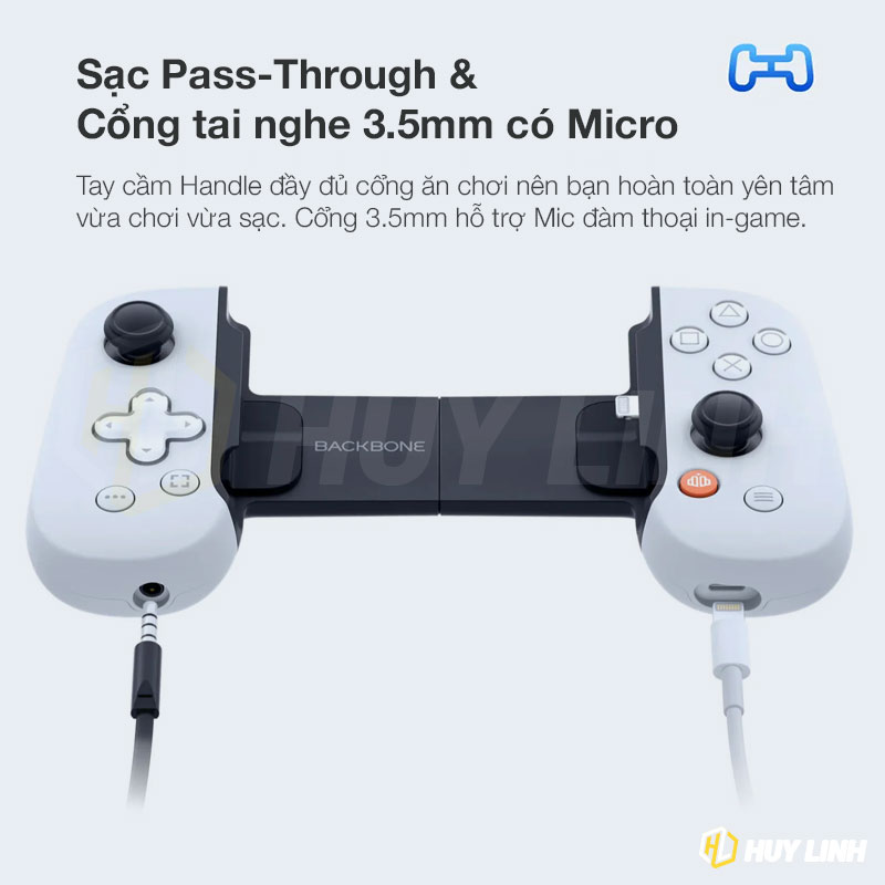 - CỔNG SẠC LIGHTNING & CỔNG TAI NGHE 3.5 mm Backbone One sẽ có một cổng Lighting để sạc và giao tiếp với iPhone, bên cạnh đó tay cầm còn cung cấp cổng lightning để vừa sạc vừa chơi, và cổng tai nghe 3.5mm luôn, tiện lợi nhất có thể cho việc chơi game. Tay cầm dùng nguồn trực tiếp từ cổng Lightning của iPhone, không cần pin hay sạc. Đặt biệt bên trong đã bao gồm Adapter giúp người dùng iPhone 13 Pro, iPhone 13 Pro Max, iPhone 14 Pro, iPhone 14 Pro Max có thể chơi tốt hơn mà không sợ cấn camera.