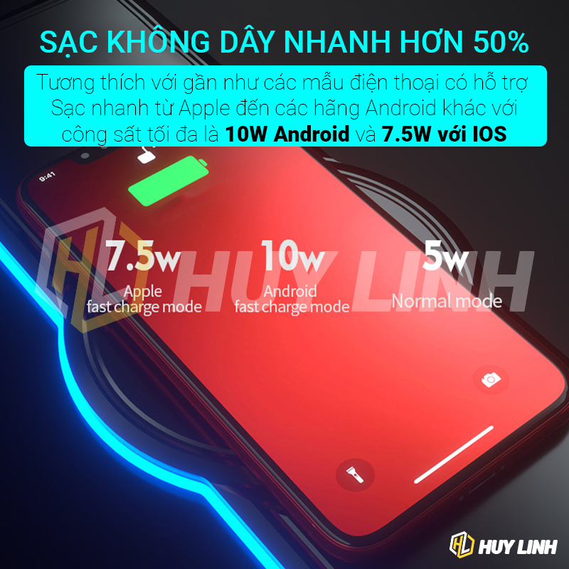 - Hỗ trợ sạc nhanh không dây tiêu chuẩn Qi: Android 10W, IOS 7.5W