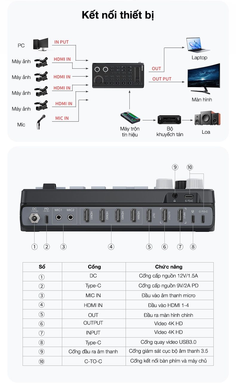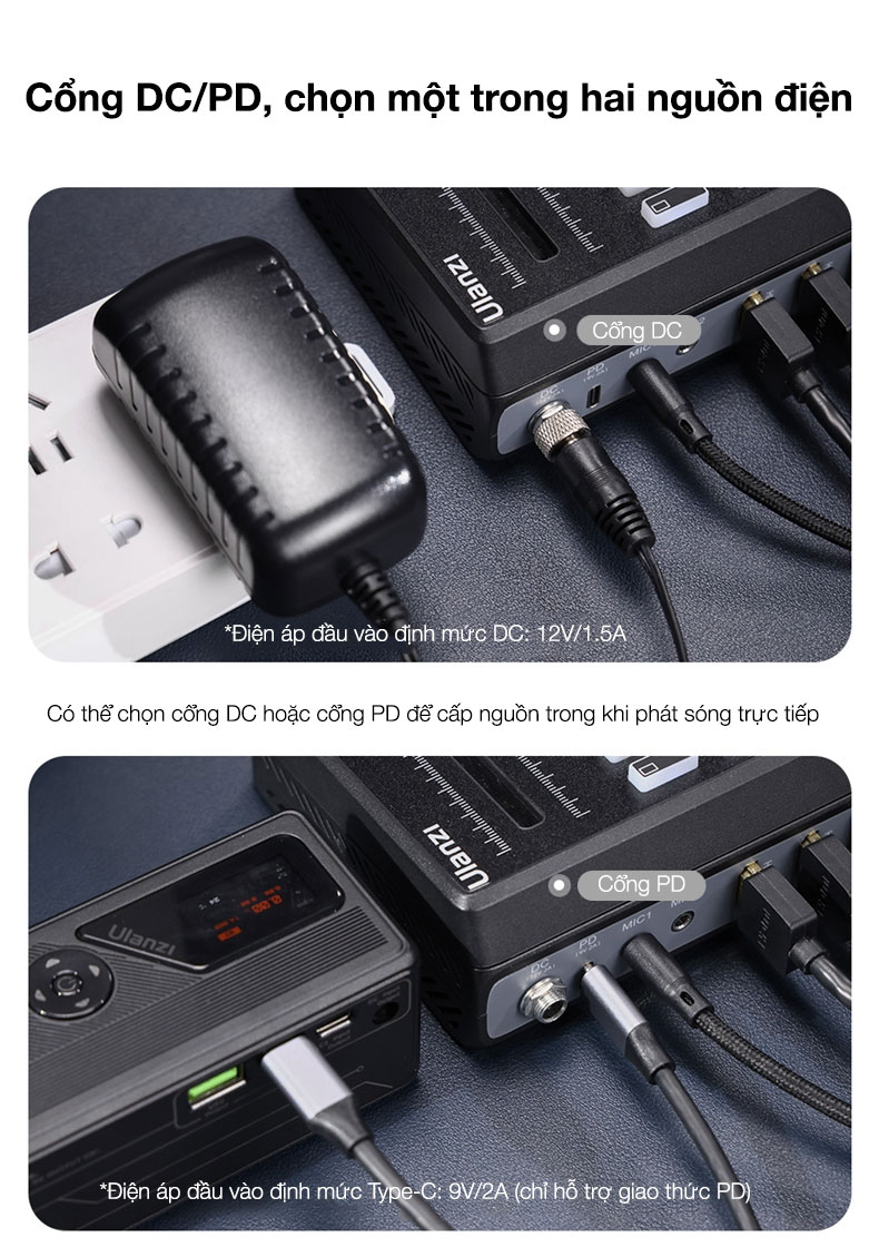 - Có thể chọn cổng DC hoặc cổng PD để cấp nguồn trong khi phát sóng trực tiếp