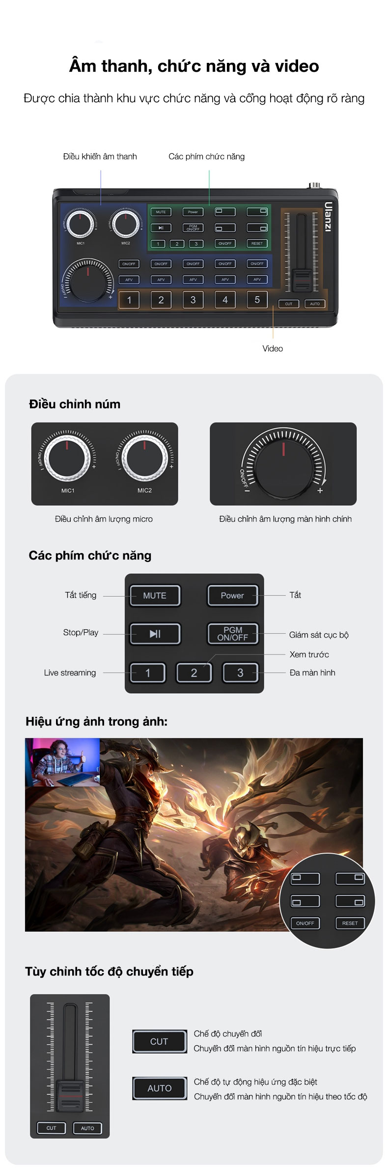 - Âm thanh, chức năng và video được chia thành khu vực chức năng và cổng hoạt động rõ ràng