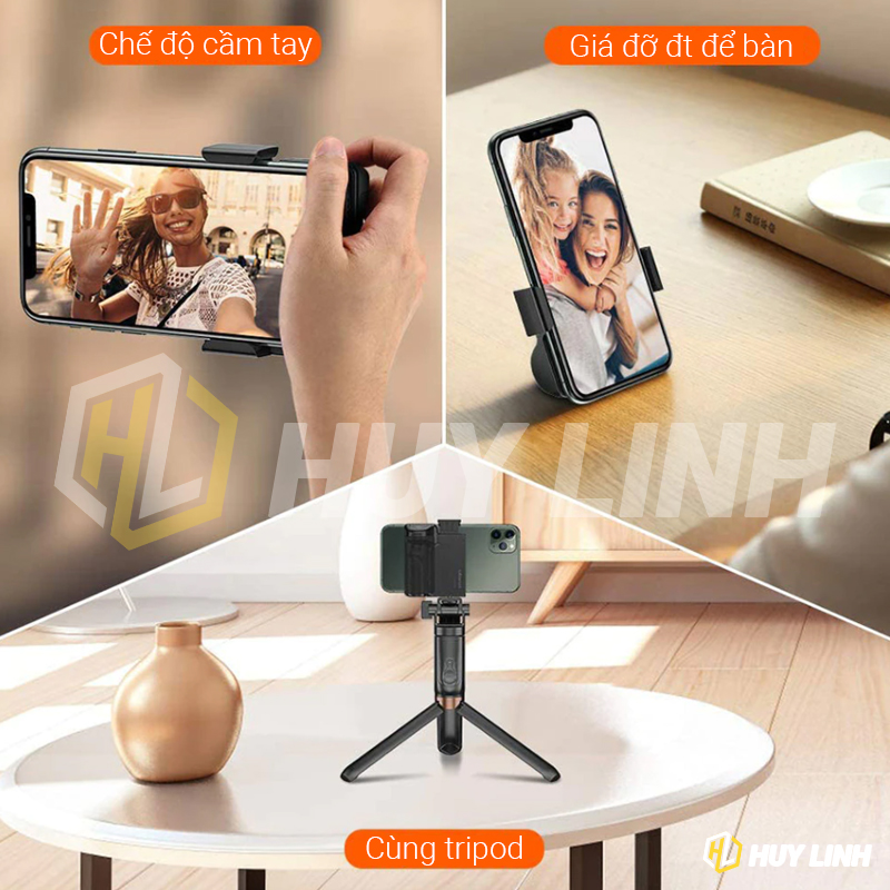 - Có nhiều ứng dụng: cầm tay, Giá đỡ máy tính để bàn, chế độ Gậy chụp ảnh tự sướng hoặc chế độ chân máy.