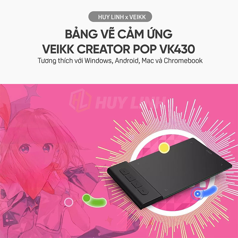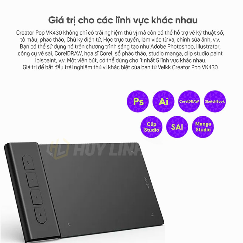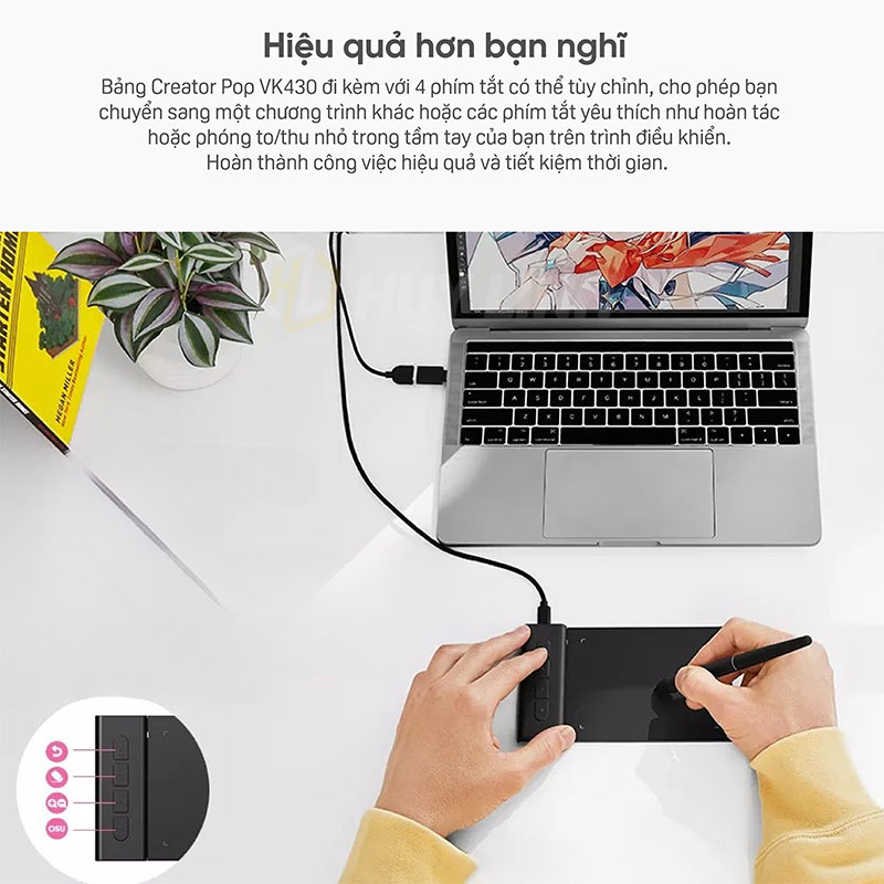 - Máy tính bảng bút Creator Pop vk430 đi kèm với 4 phím nhanh có thể tùy chỉnh cho phép bạn chuyển sang một chương trình khác hoặc các phím tắt yêu thích như hoàn tác hoặc phóng to/thu nhỏ trong tầm tay trên trình điều khiển.