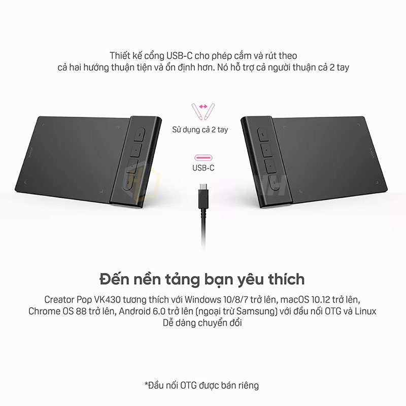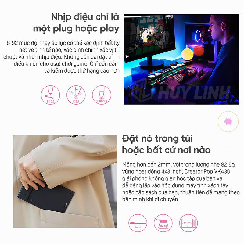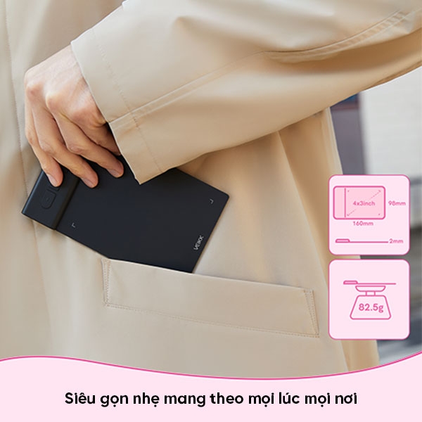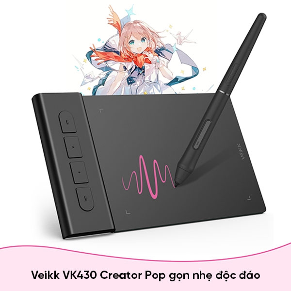 - Bề mặt máy tính bảng bút veikk Creator Pop vk430 mỏng hơn đến 2mm, với trọng lượng nhẹ 82.5g và Vùng hoạt động 4x3 inch. Dễ dàng bỏ vào túi đựng máy tính xách tay hoặc trong cặp sách, thuận tiện mang theo bên mình khi di chuyển.