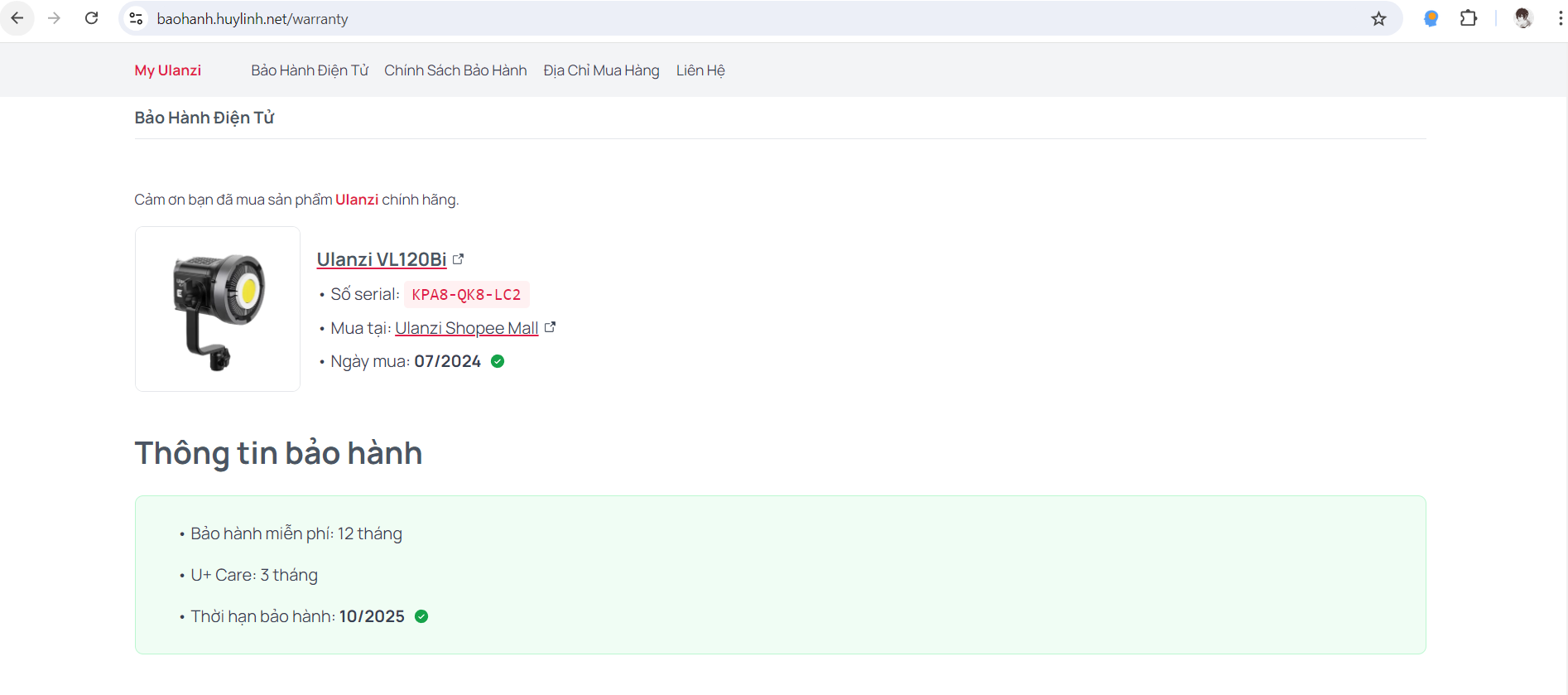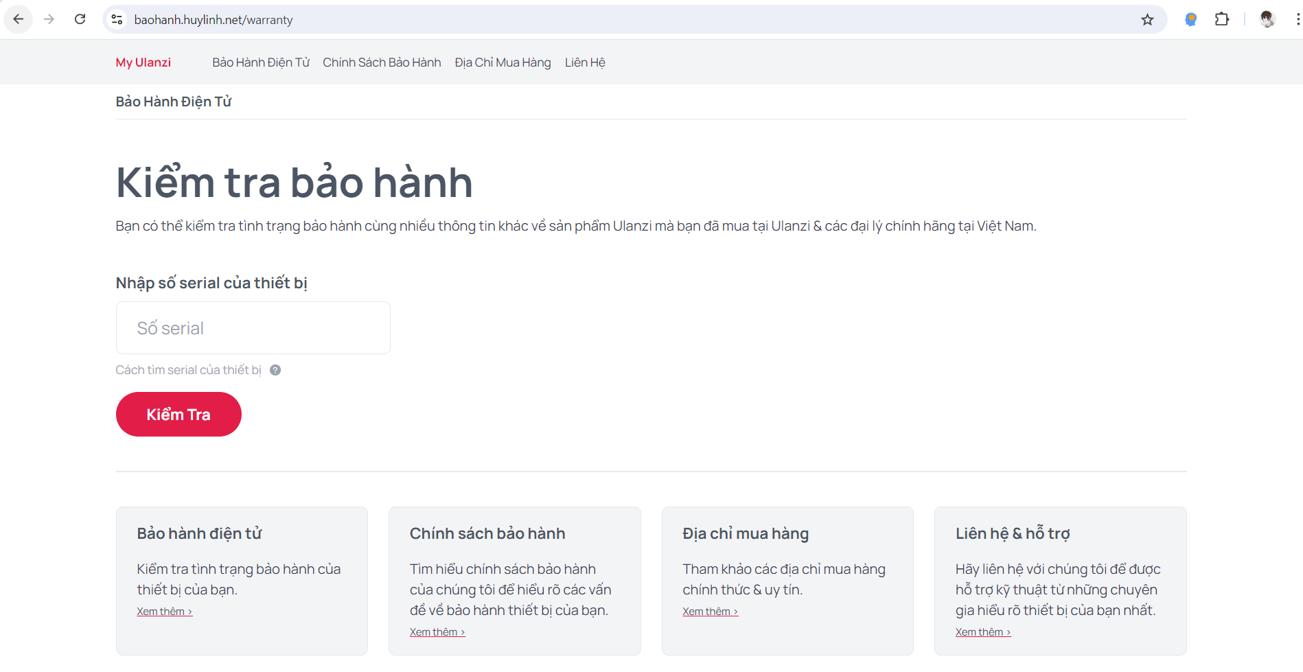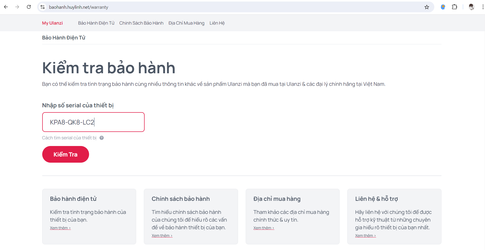 Sau khi lấy được số serial của sản phẩm quý khách truy cập vào trang https://baohanh.huylinh.net/warranty để kiểm tra thông tin bảo hành.