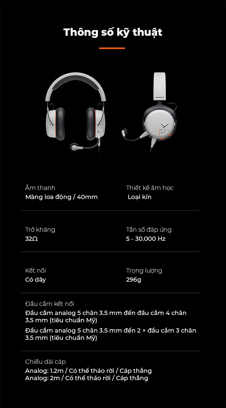 - Cáp & phích cắm: Cáp Analog 1,2 M dành cho thiết bị có đầu nối Jack 4 chân và cáp Analog 2 M dành cho PC,