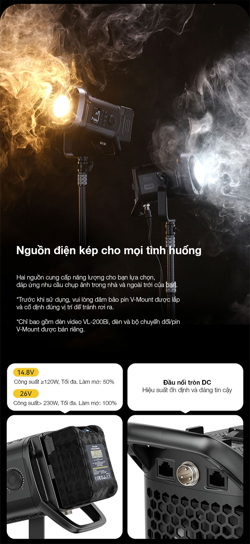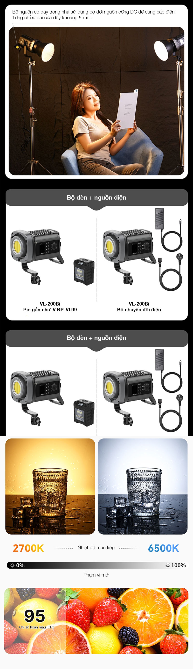 - Dải nhiệt màu 2500K - 6700K cường độ sáng tối đa lên tới 48300Lux
