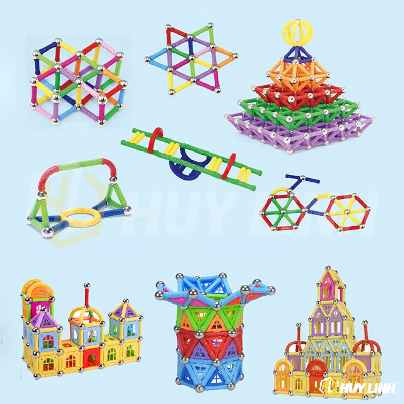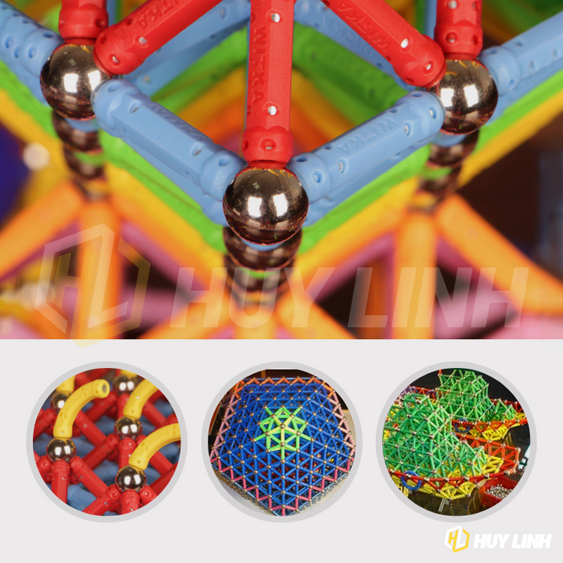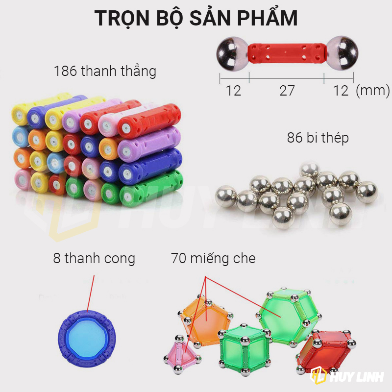 - Bộ bao gồm: 186 Thanh nam châm, 86 bi thép, 7 thanh cong, 70 miếng che