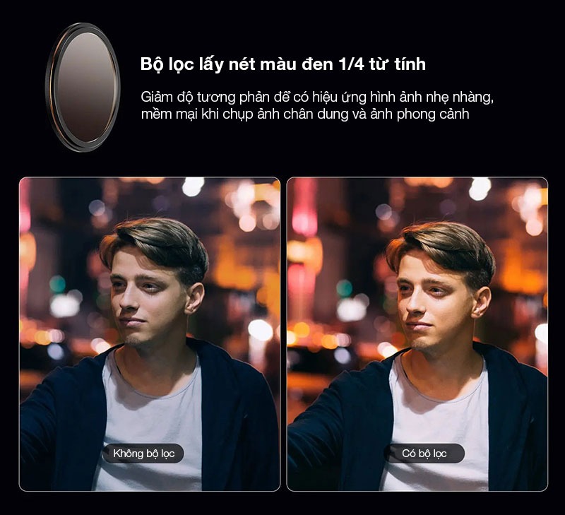 - Bộ lọc lấy nét mềm màu đen 1/4 từ tính: Giảm độ tương phản để có hiệu ứng hình ảnh nhẹ nhàng, mềm mại khi chụp ảnh chân dung và ảnh phong cảnh