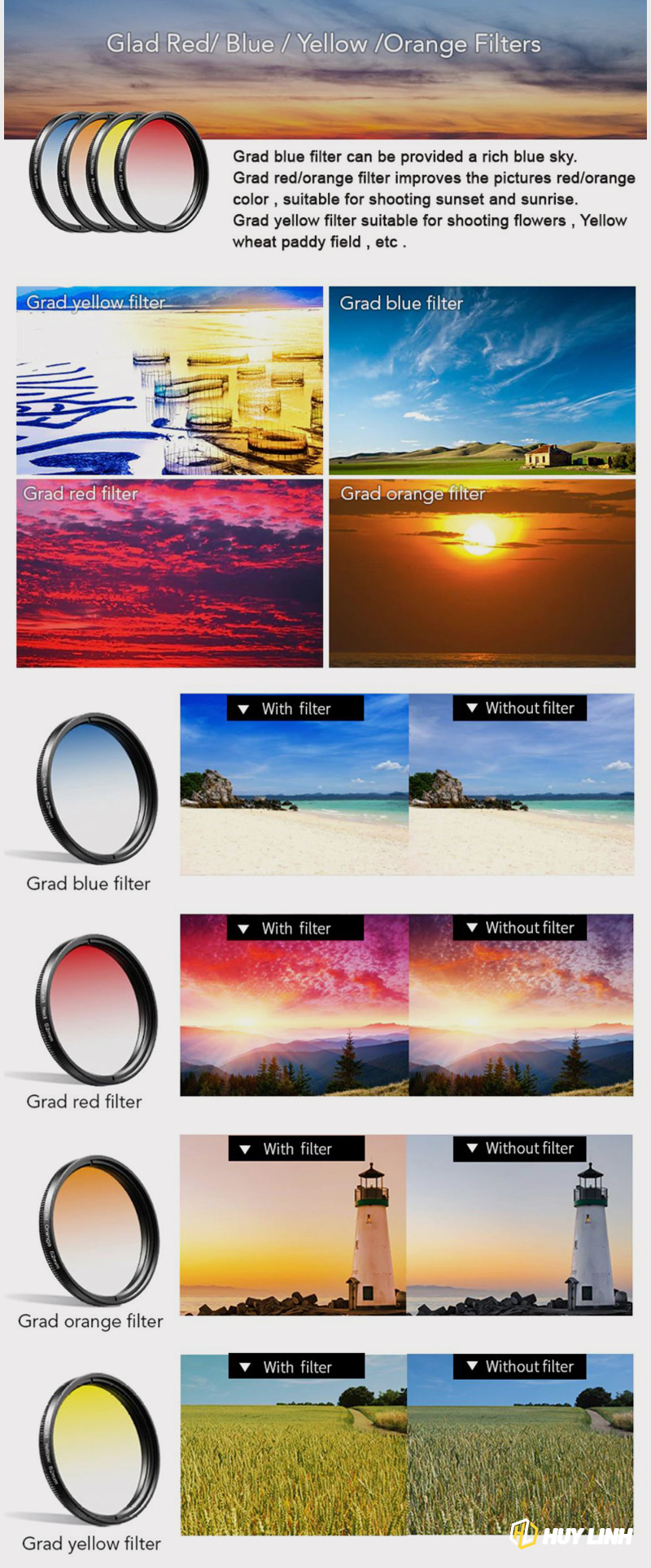 - Kính lọc màu Grad: Được gắn trên khung xoay, điều chỉnh góc chụp. Hoàn hảo để thay đổi tâm trạng của một hình ảnh. Tuyệt vời để chụp ảnh bầu trời, hoàng hôn, mây hồng, nước hồ, v.v.