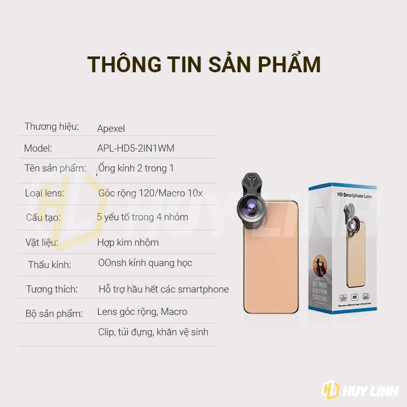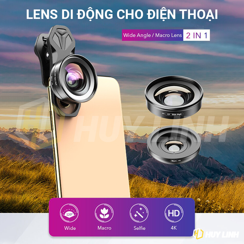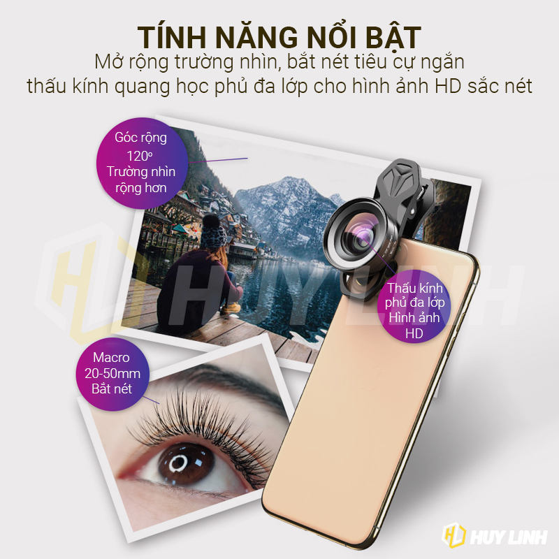 - Ống kính di động cho điện thoại APEXEL-HD52IN1, có thể đạt tiêu cự 16mm, góc nhìn có thể đạt 120 °, độ phóng đại 0,6 lần.