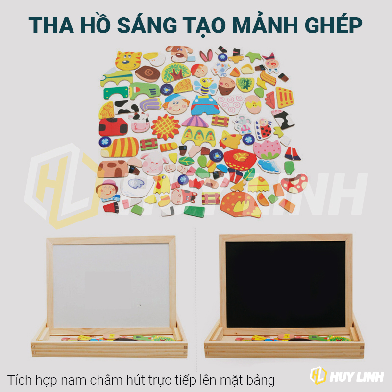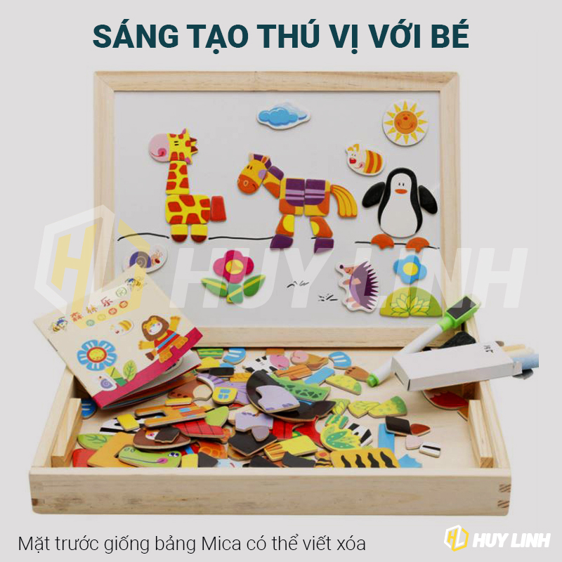 - Bảng viết nam châm 2 mặt cùng hình ghép đáng yêu cho bé giúp trẻ sáng tạo trong cách bày biện, thiết kế không gian theo trí tưởng tượng của bé.