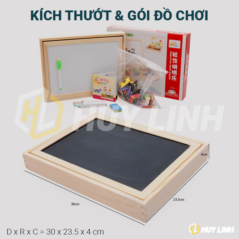 - 1 x Bảng có 2 mặt (1 mặt bé có thể xếp hình và 1 mặt bé tập viết)