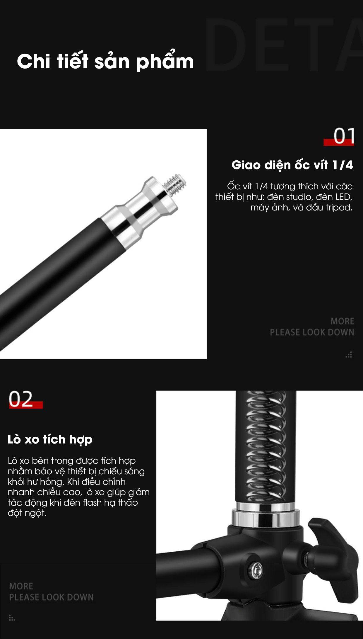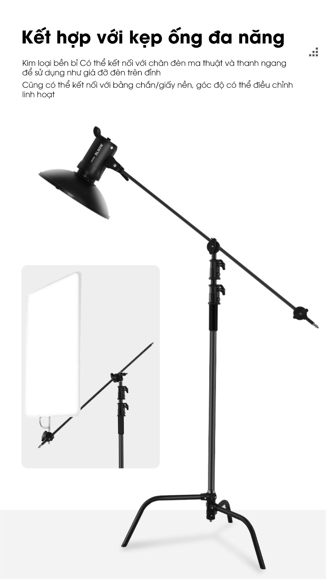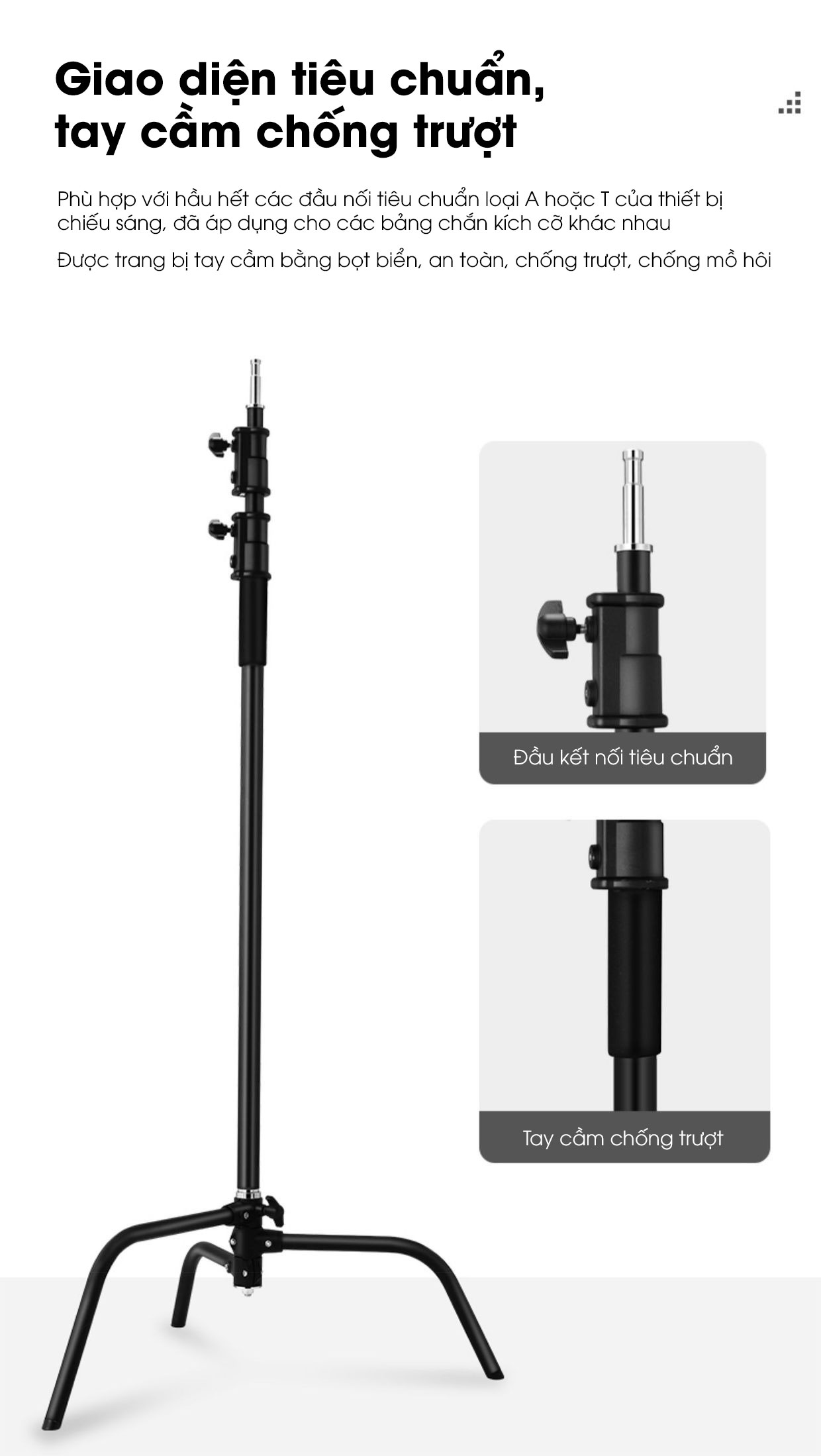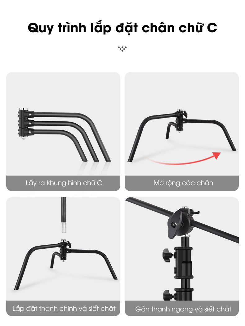 - Ốc vít 1/4 tương thích với các thiết bị như đèn studio, đèn LED, máy ảnh, và đầu tripod