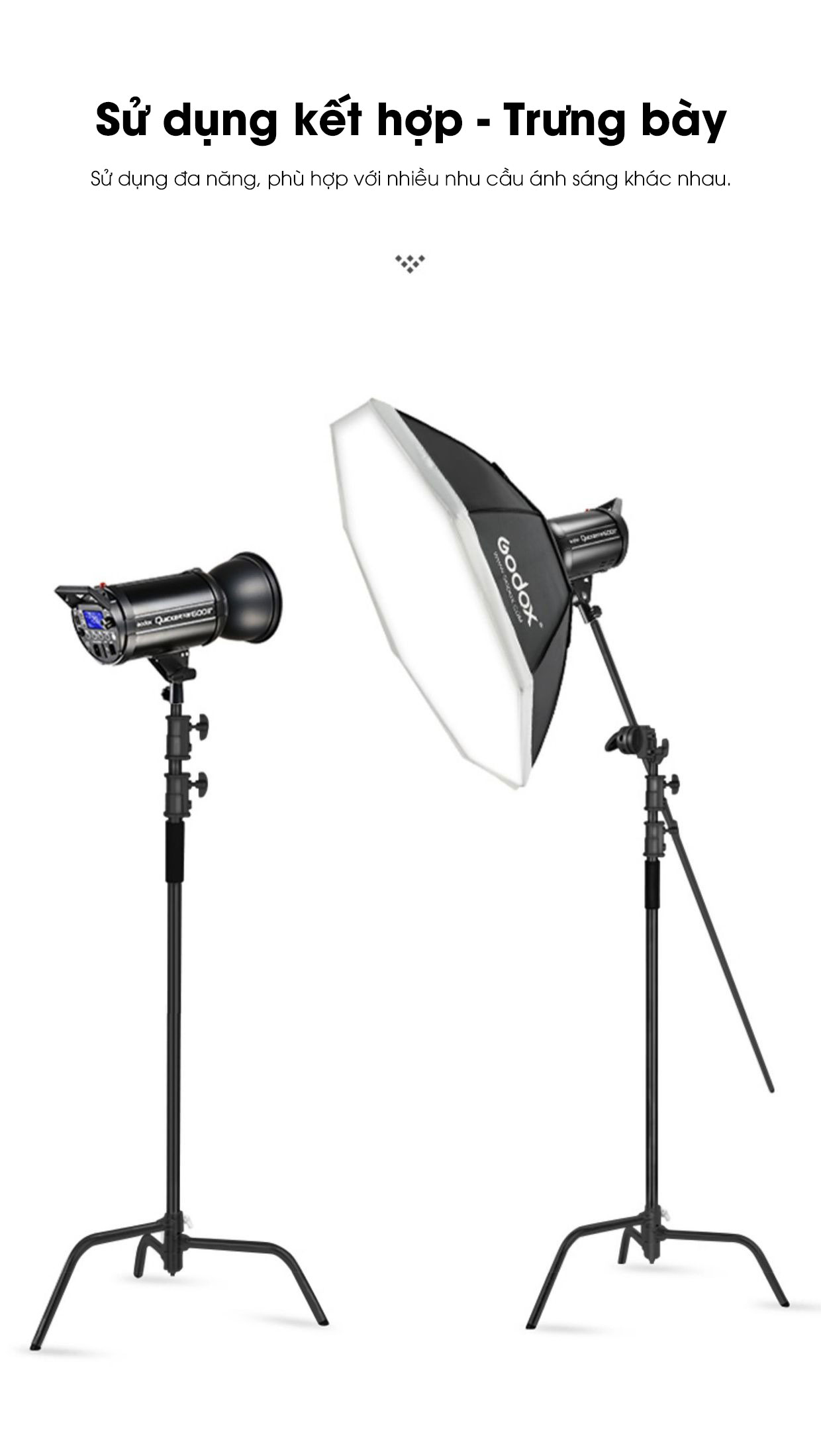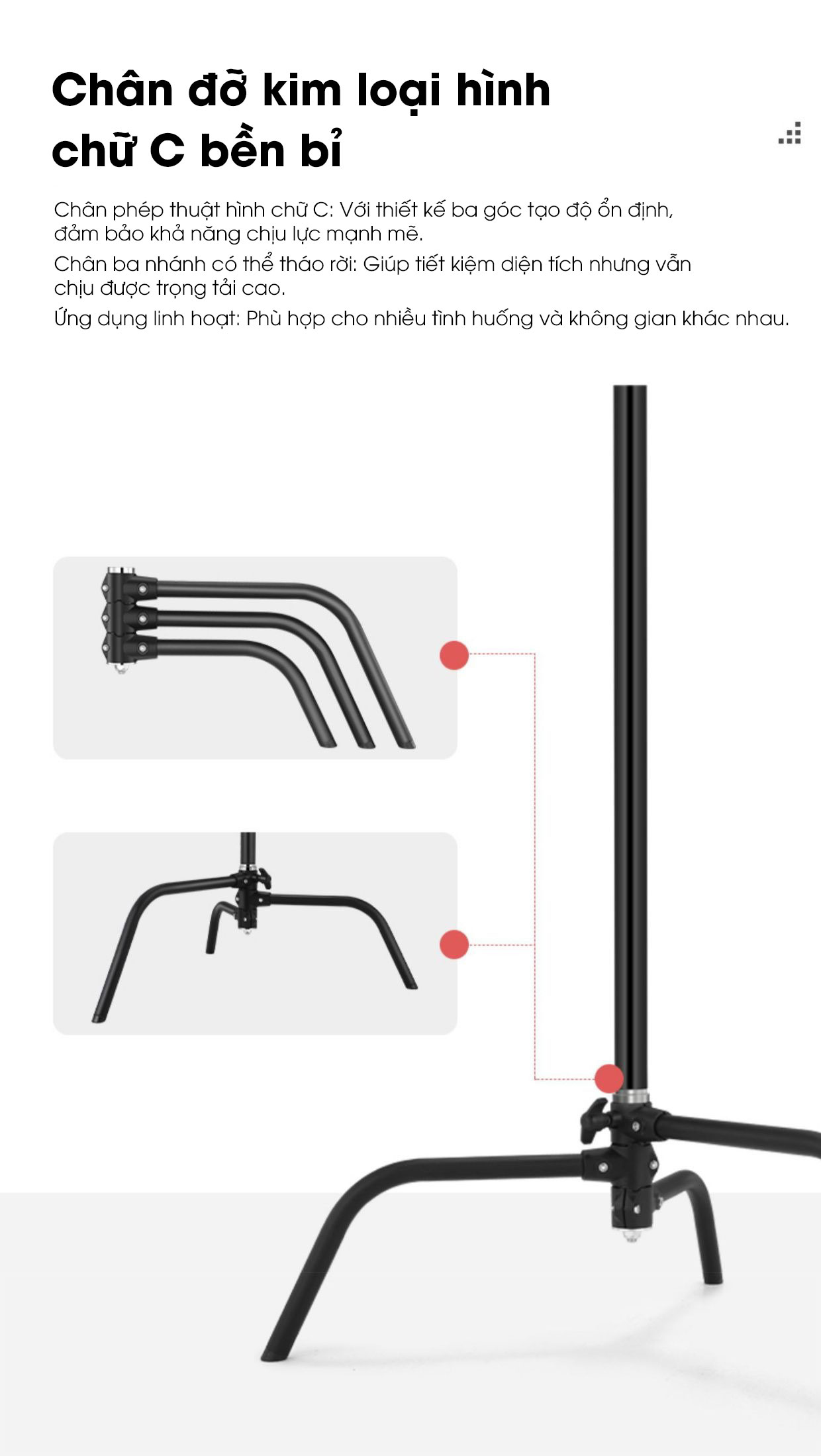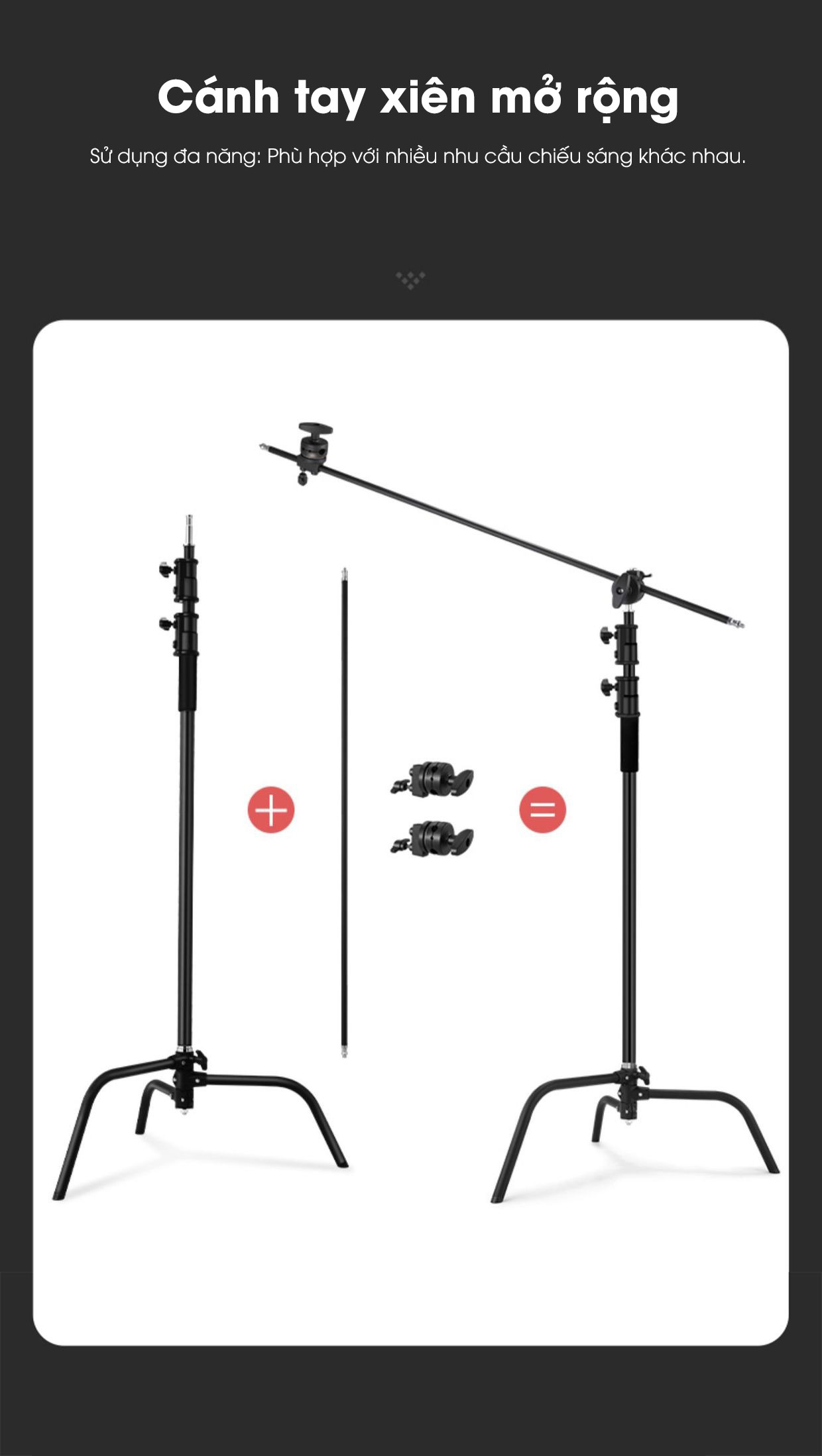- Ốc vít 1/4 tương thích với các thiết bị như đèn studio, đèn LED, máy ảnh, và đầu tripod