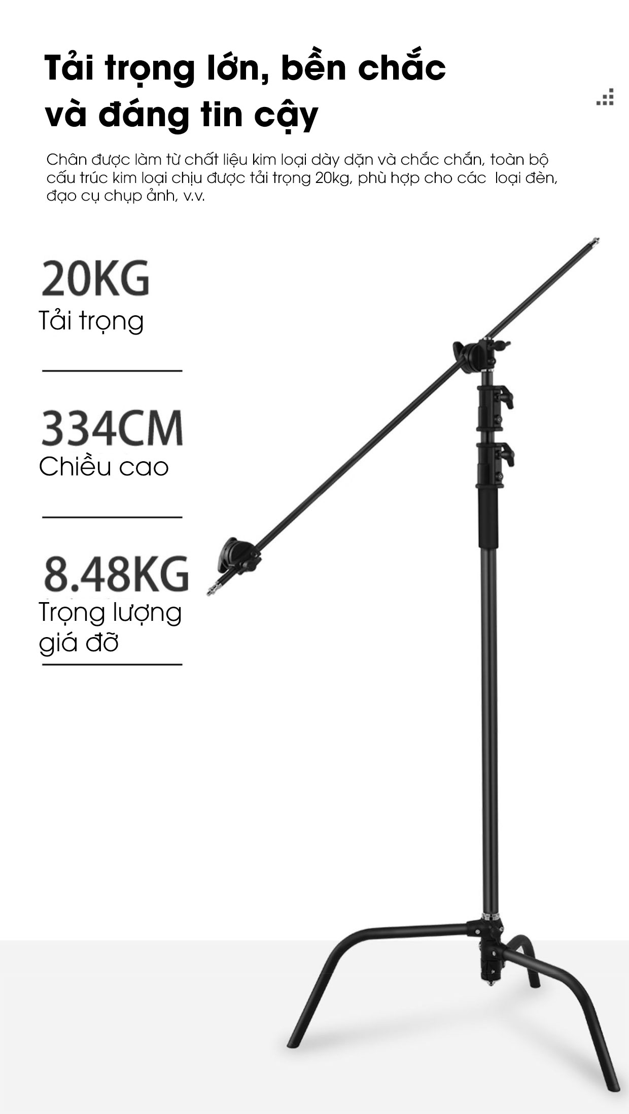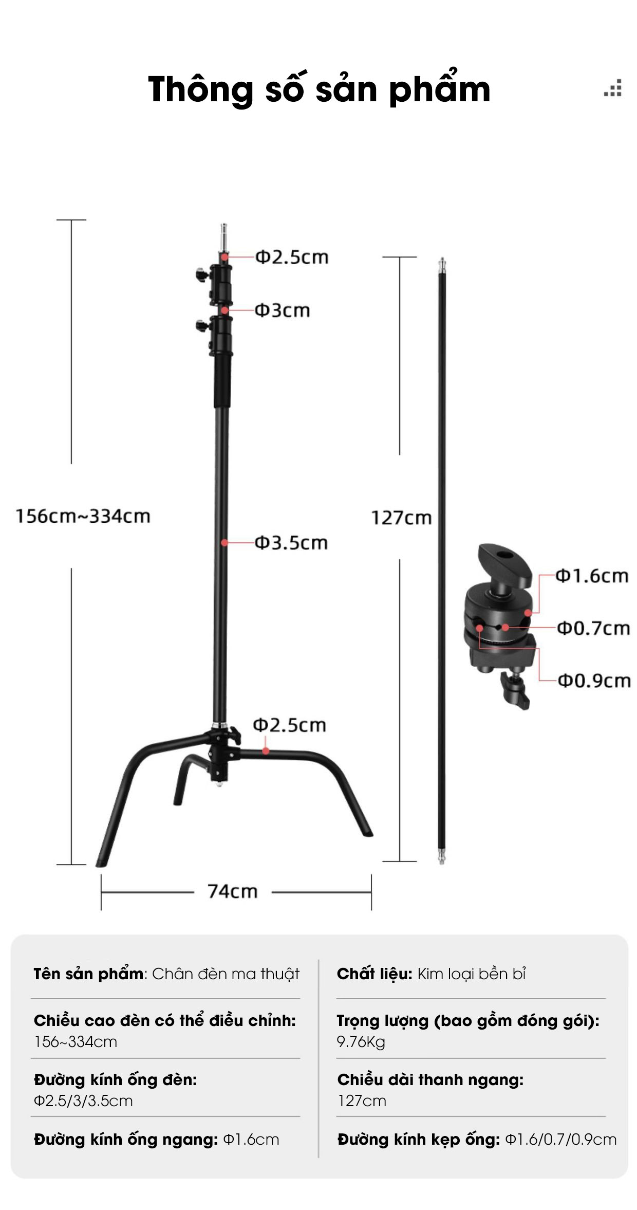 - Chiều cao đèn có thể điều chỉnh: 156~334cm