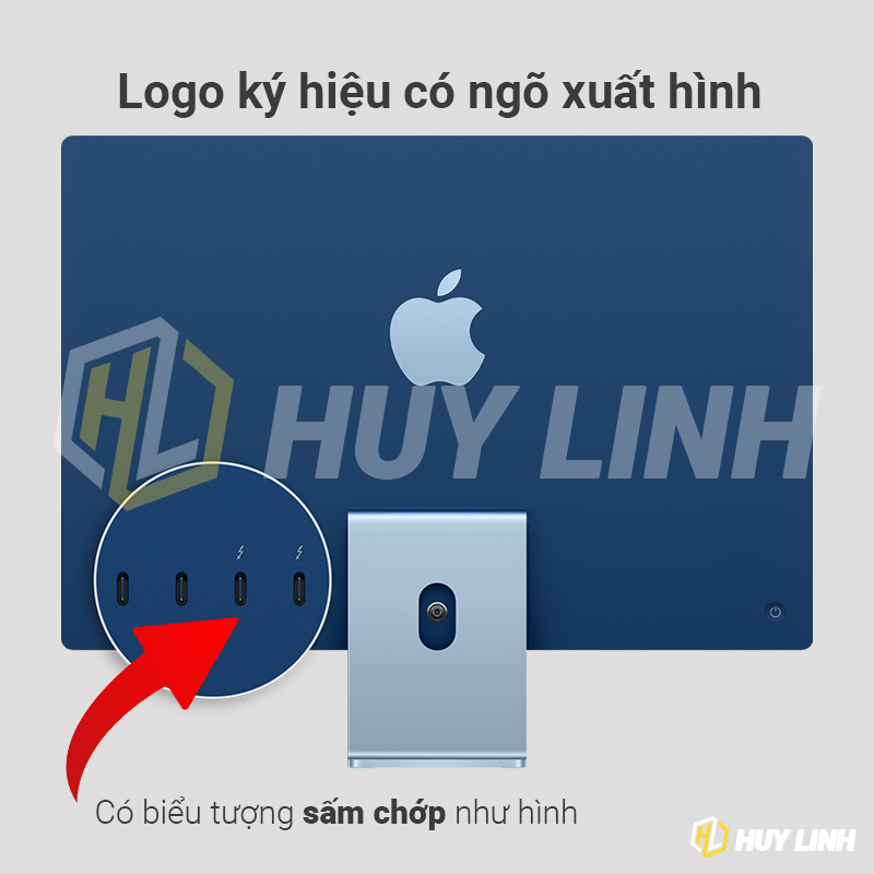 Trên iMac (24 inch, M1, 2021), biểu tượng sấm chớp xuất hiện phía trên mỗi cổng Thunderbolt/USB 4. Để kết nối thêm với màn hình phụ khác, hãy sử dụng một trong hai cổng có biểu tượng Thunderbolt như hình bên trên.