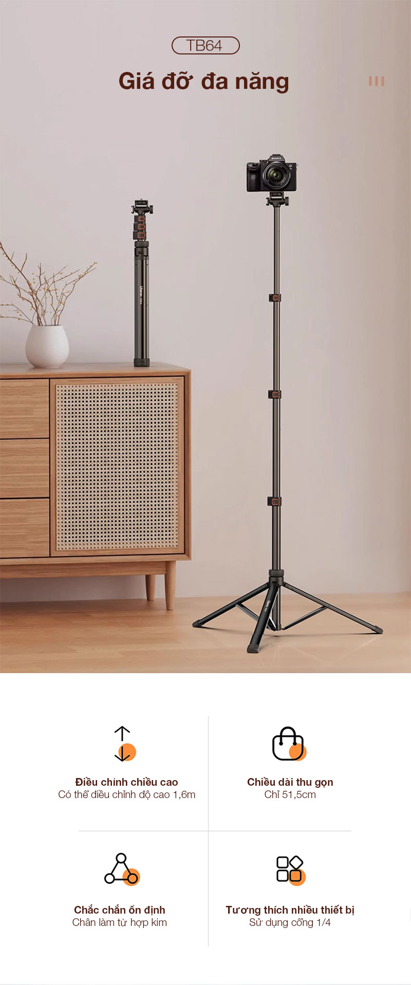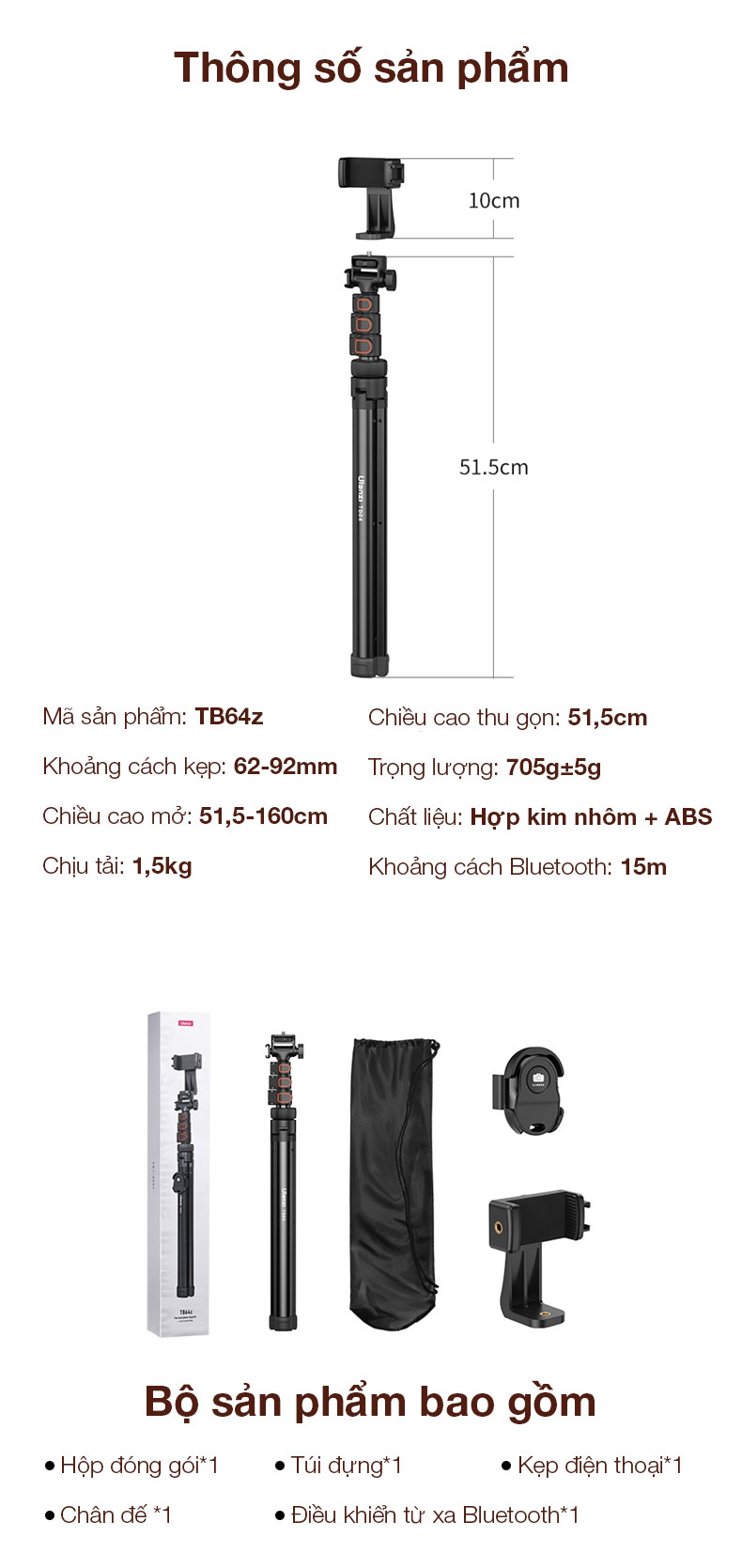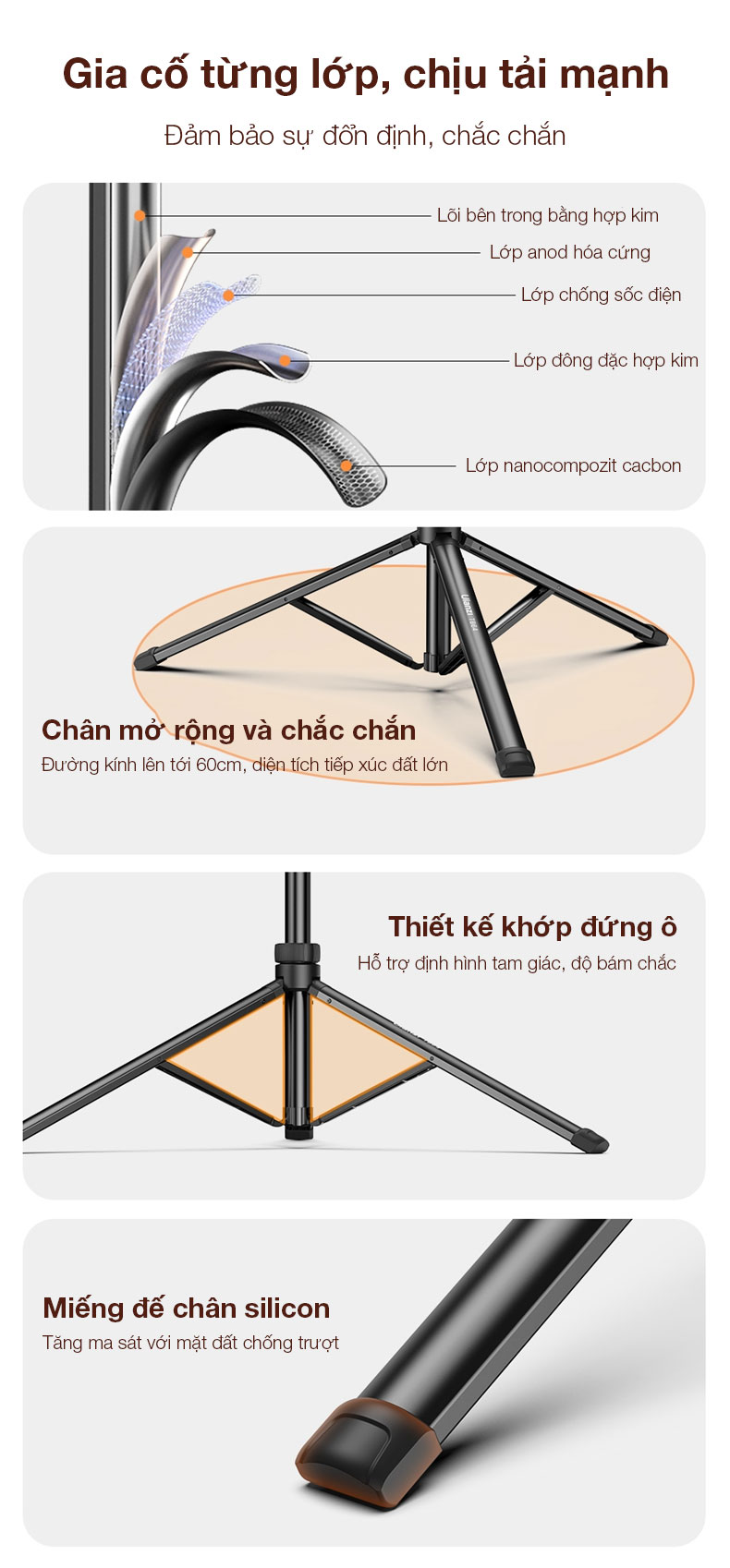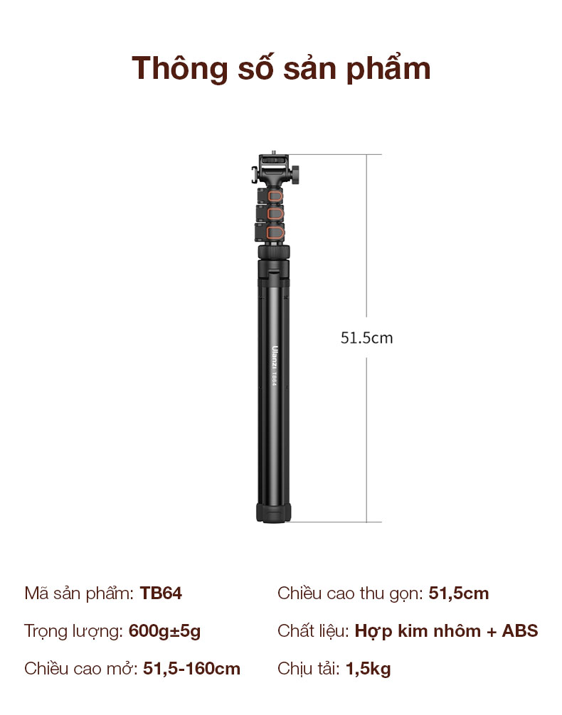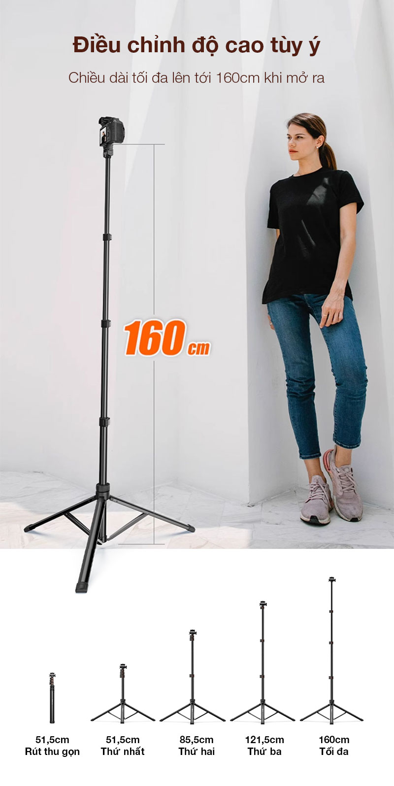 - Thiết kế thông minh với chiều cao tối đa 160cm, khi gập gọn chỉ còn 51.5cm dễ dàng mang theo trong các chuyến đi.