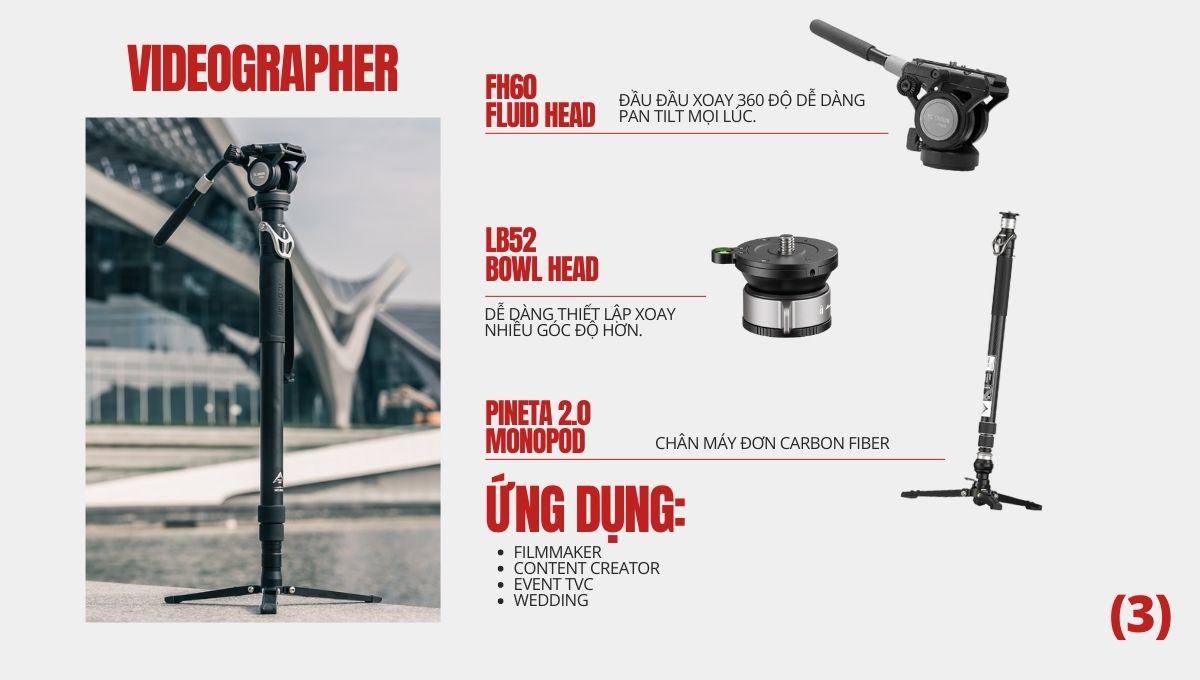Với thiết kế đột phá, Pineta Pro không chỉ là một chân máy đơn thông thường. Nó được sinh ra để trở thành một "sát thủ" thao tác nhanh, là trợ thủ đắc lực cho các filmmaker, wedding, nhiếp ảnh gia thể thao và sự kiện, những người luôn đặt yếu tố tốc độ lên hàng đầu.