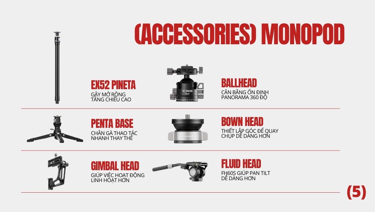 Rất nhiều phụ kiện cho Monopod chân máy đơn quay video được YC Onion sản xuất
