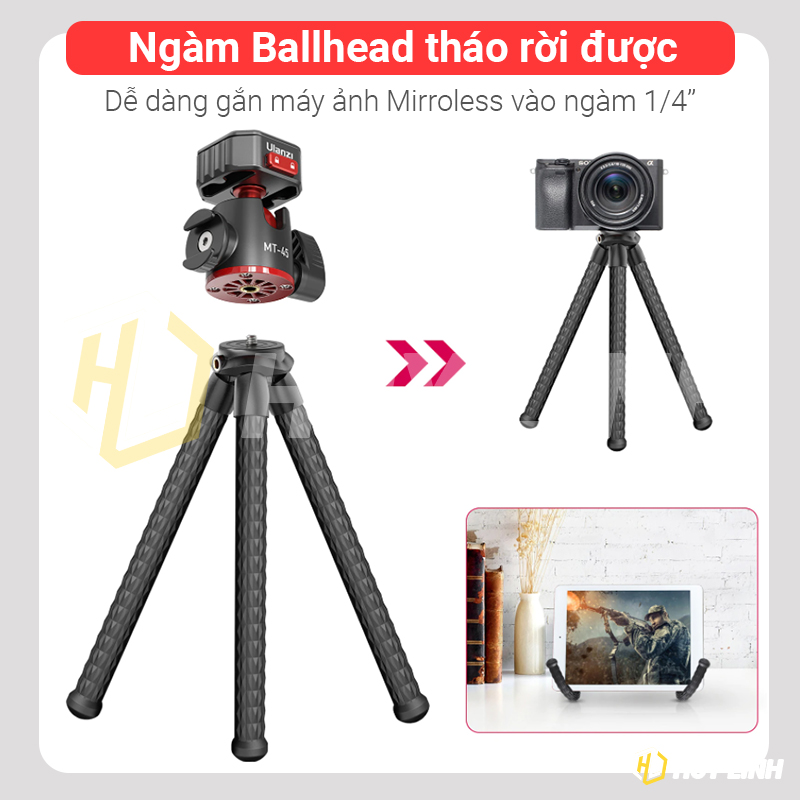 - Thiết kế chân máy & đầu bi có thể tháo rời: chân máy và đầu bi có thể tách rời và sử dụng riêng biệt. 1/4InchThiết kế vít cho phép bạn lắp trực tiếp hầu hết các thiết bị vào chân máy và đầu bi 1/4InchLỗ vít dưới có thể được gắn vào giá đỡ khác.