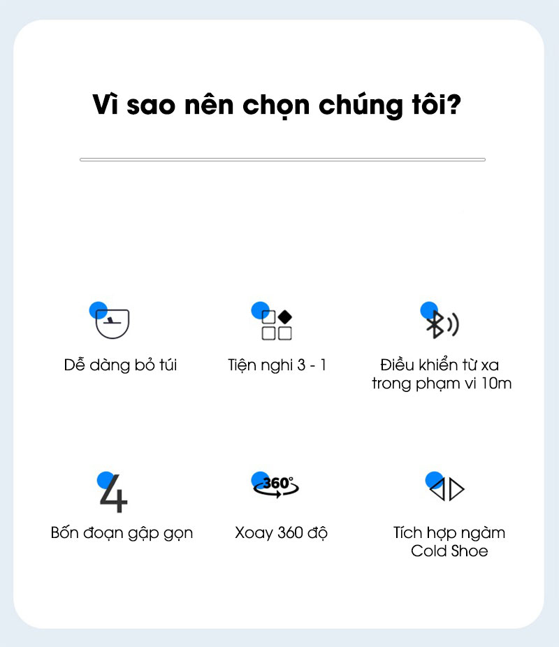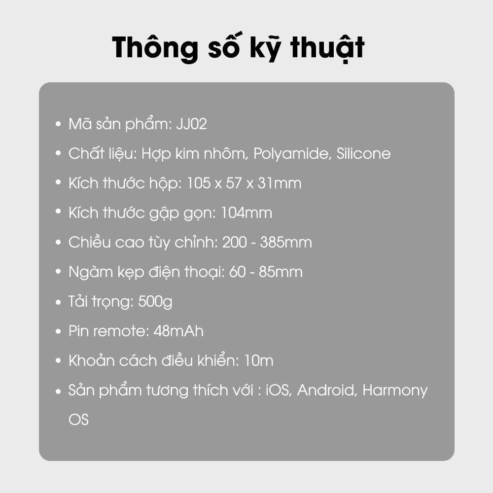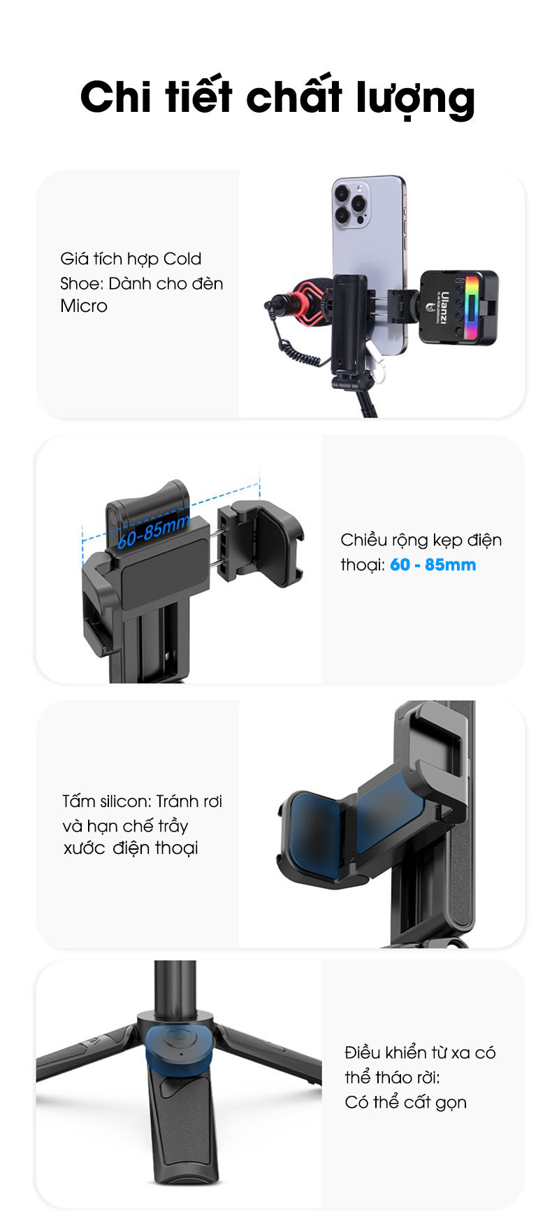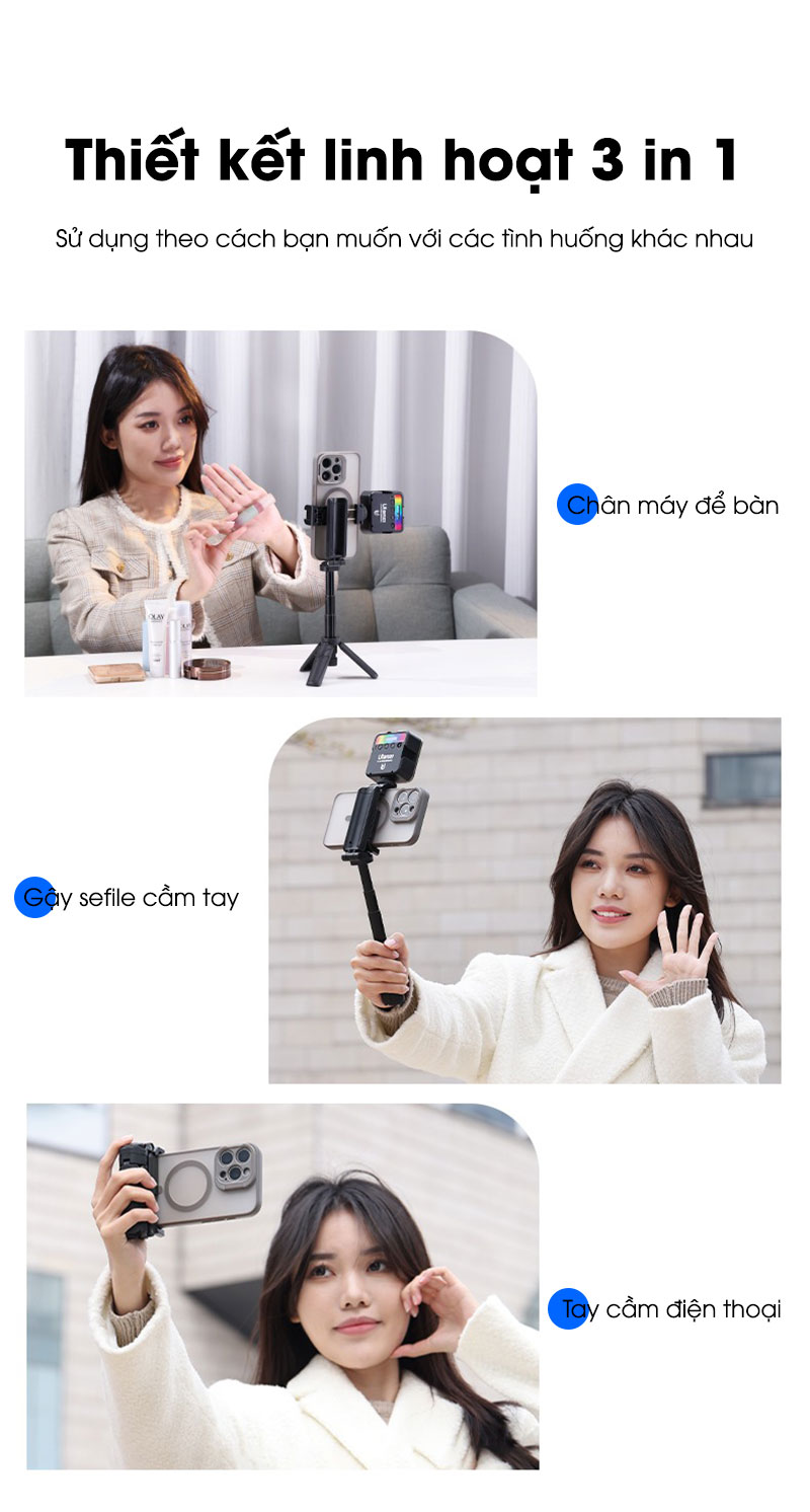 - Có thể dùng làm giá đỡ điện thoại, gậy selfie, ngàm kẹp.