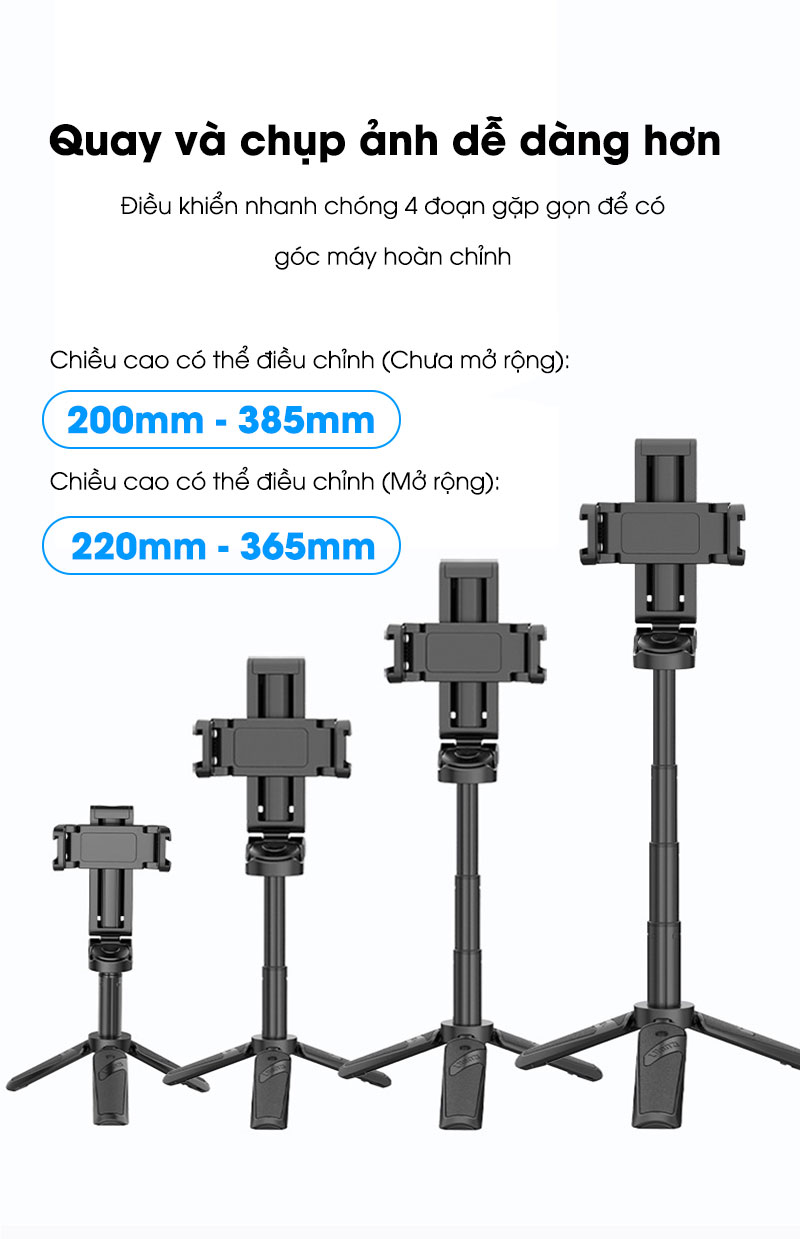 - Tùy chỉnh độ cao dễ dàng với 4 đoạn gập gọn