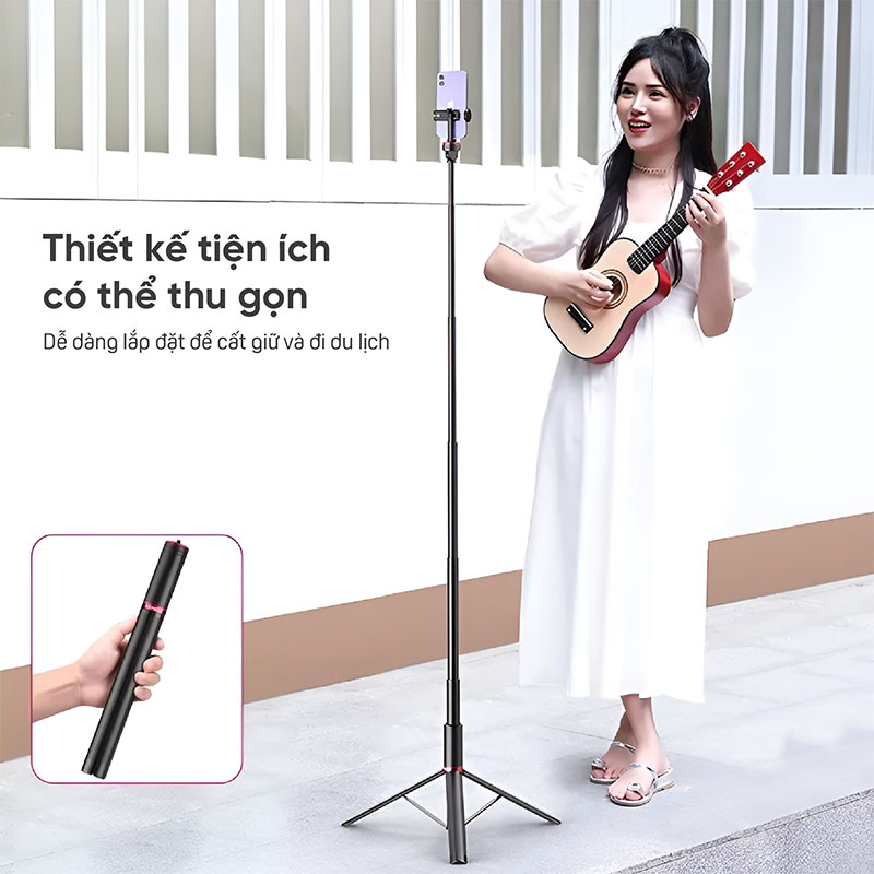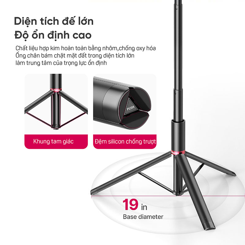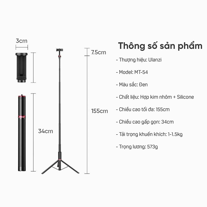 Ulanzi MT-54 là chân tripod đa năng có thể dùng làm giá đỡ 3 chân cho điện thoại, máy ảnh, webcam hay là chân đèn led đều được. Với thiết kế bằng kim loại chắc chắn có khả năng tải lên tới 1.5kg tương thích với nhiều thiết bị hơn. Chân tripod Ulanzi MT-54 có thể điều chỉnh chiều cao từ 34cm đến 155cm giúp ban dễ dàng mang theo sử dụng và tùy chỉnh góc quay. Giá đỡ 3 chân kiêm gậy chụp hình selfie Ulanzi MT-54 sẽ là phụ kiện chụp ảnh, livestream không thể bỏ qua cho các vloger.