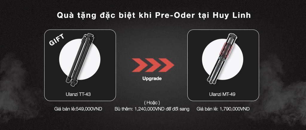 - Tặng kèm Tripod chân đèn Ulanzi TT-43 trị giá 549.000 VNĐ hoặc Quý Khách có thể đổi qua chân máy Ulanzi MT-49 Carbon Fiber bù thêm chênh lệch.