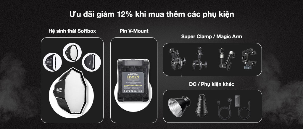 - Mua kèm thêm Softbox Quick Release giảm thêm 12% khi mua các phụ kiện như: Softbox, Pin V-Mount, Magic Arm, Super Clamp, Snoot, Bandoor, Nguồn DC