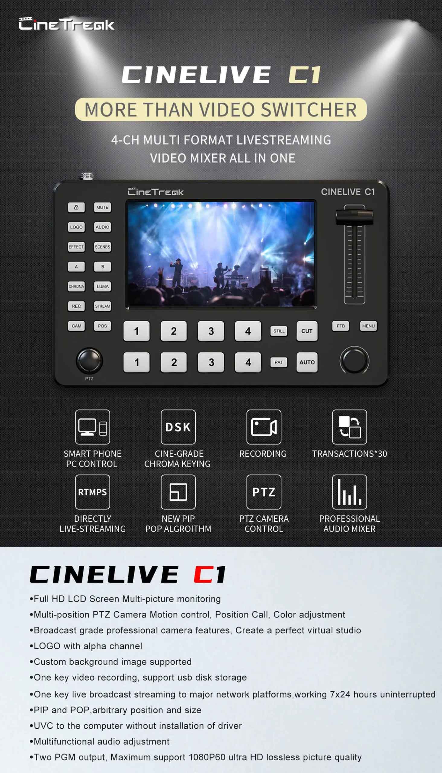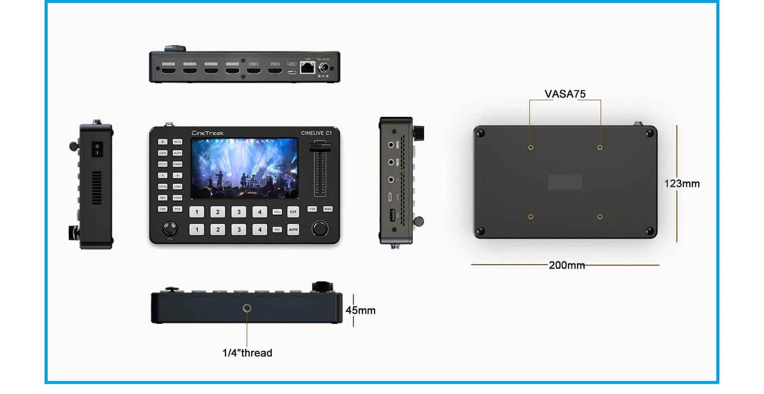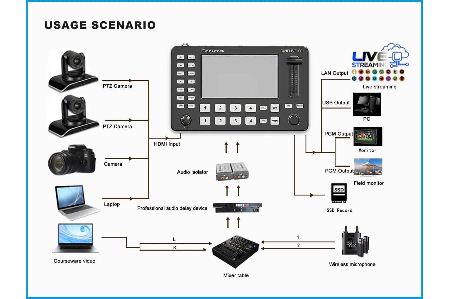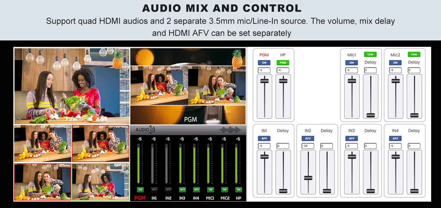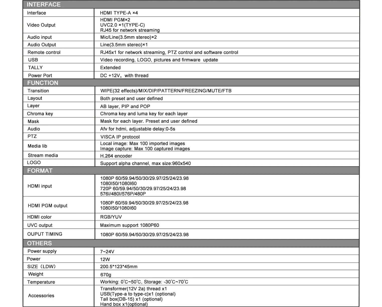 - Output: 2 HDMI dành cho PGM, 1 HDMI UVC cho Streaming