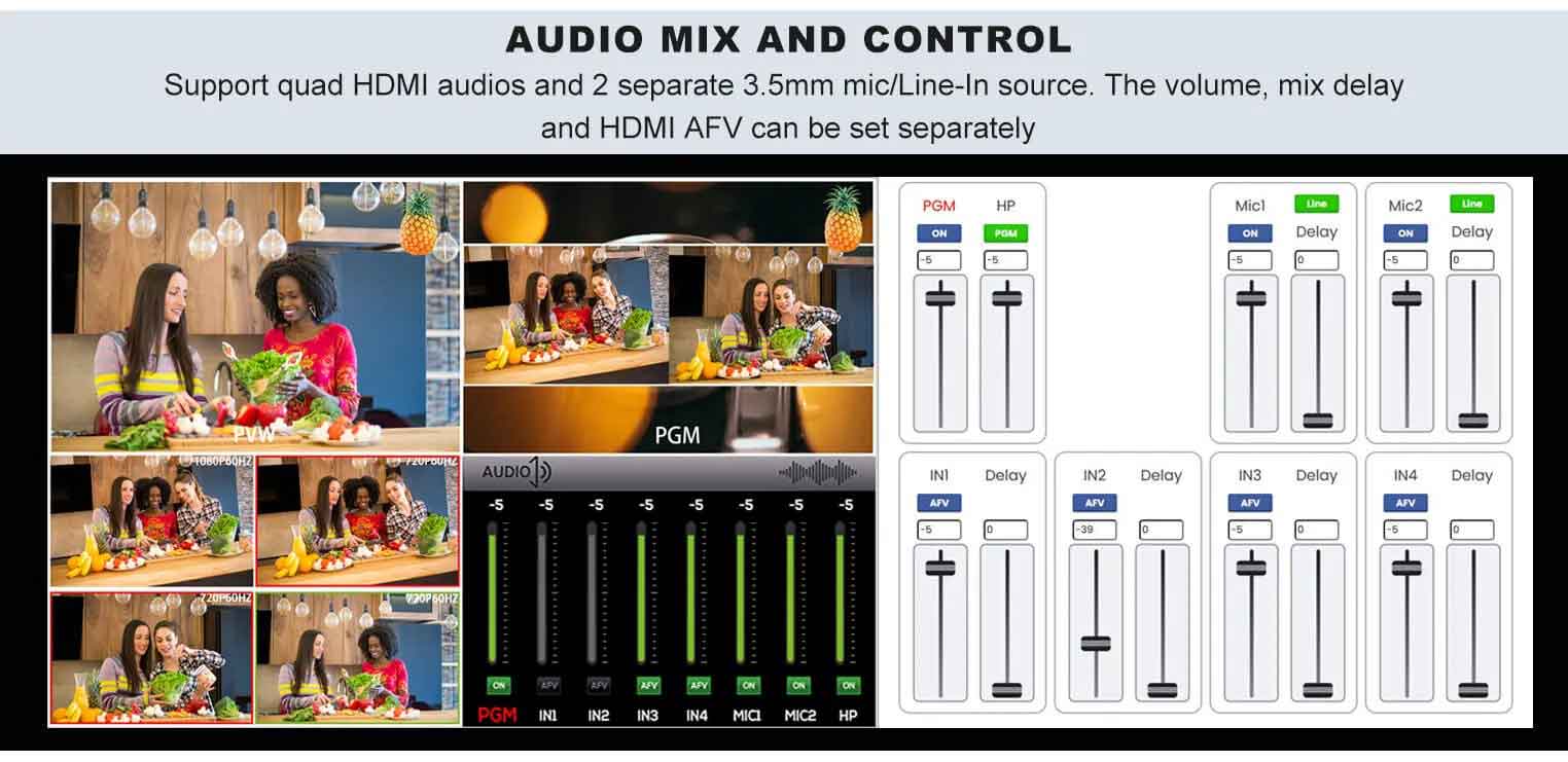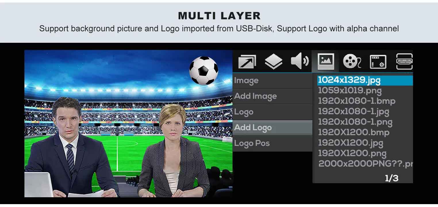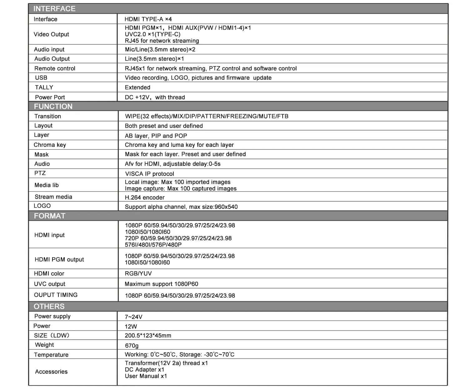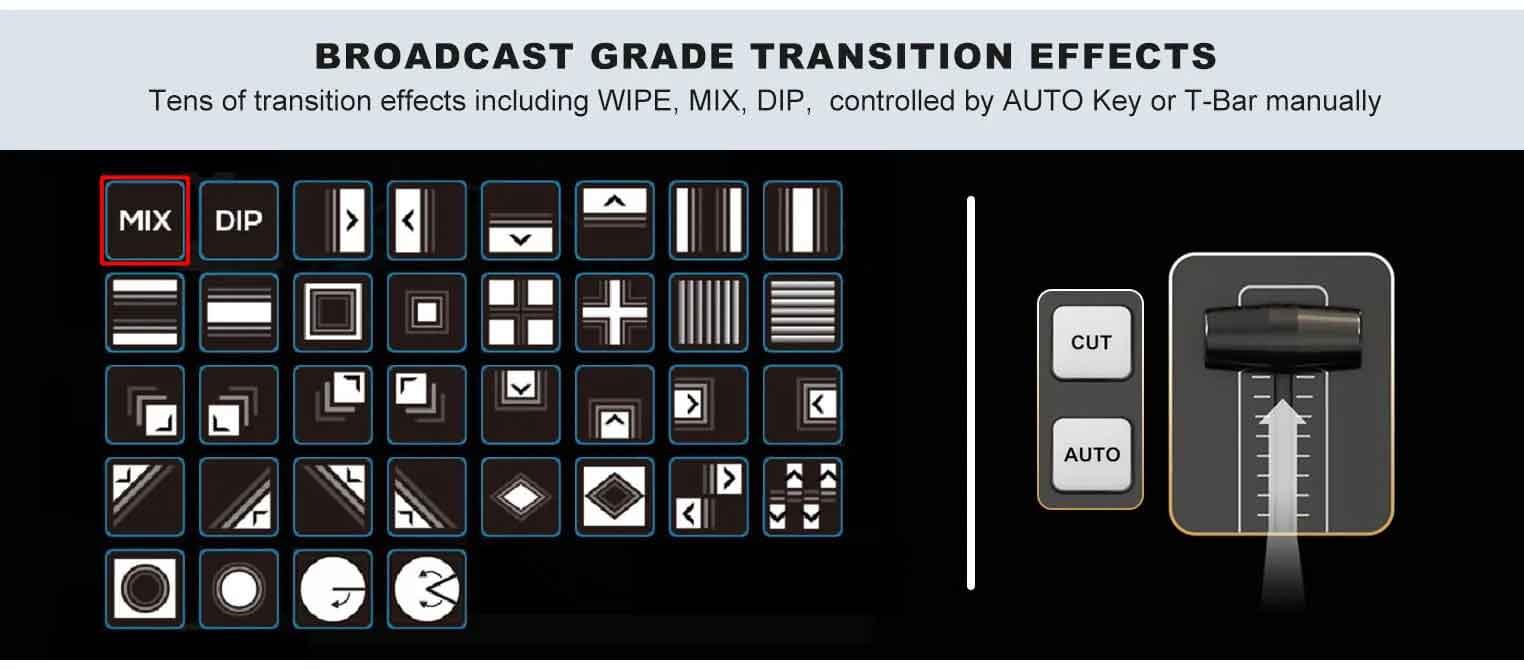 - Chuyển cảnh: WIPE(32 hiệu ứng)/MIX/DIP/ PATTERN/FREEZING/MUTE/FTB