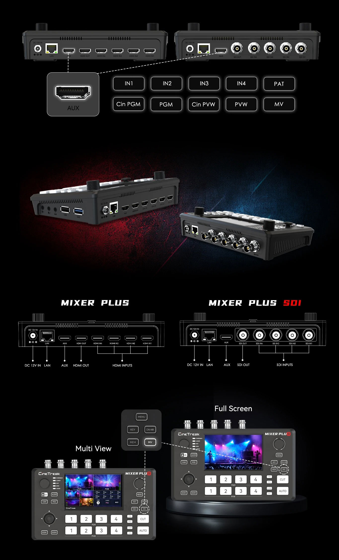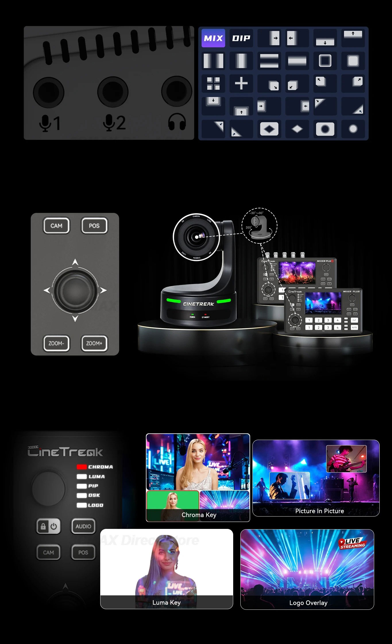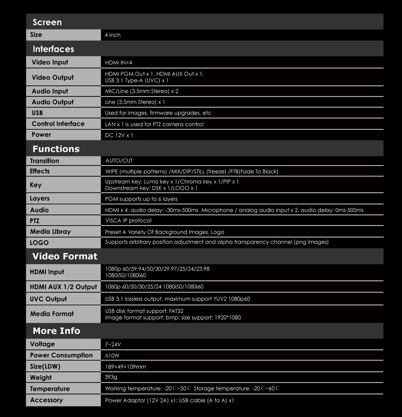 - Đầu ra video: HDMI PGM Out 1, HDMI AUX Out 1, USB 3.1 Type-A (UVC) 1