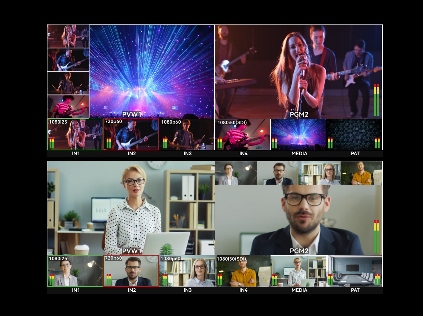 Touch-S sở hữu Chế độ Siêu Nguồn độc đáo, hỗ trợ tối đa bốn nguồn video trên màn hình cùng lúc. Người dùng có thể cấu hình và điều chỉnh tối đa bốn cửa sổ hình trong hình (PIP) theo thời gian thực trên đầu ra xem trước (PVW) hoặc chương trình (PGM). Chức năng này mang lại sự linh hoạt vượt trội cho các tình huống trực tiếp như giáo dục, họp doanh nghiệp và hội thảo trực tuyến nhiều người nói, giúp các sản phẩm phức tạp trở nên hiệu quả và hấp dẫn hơn về mặt hình ảnh.