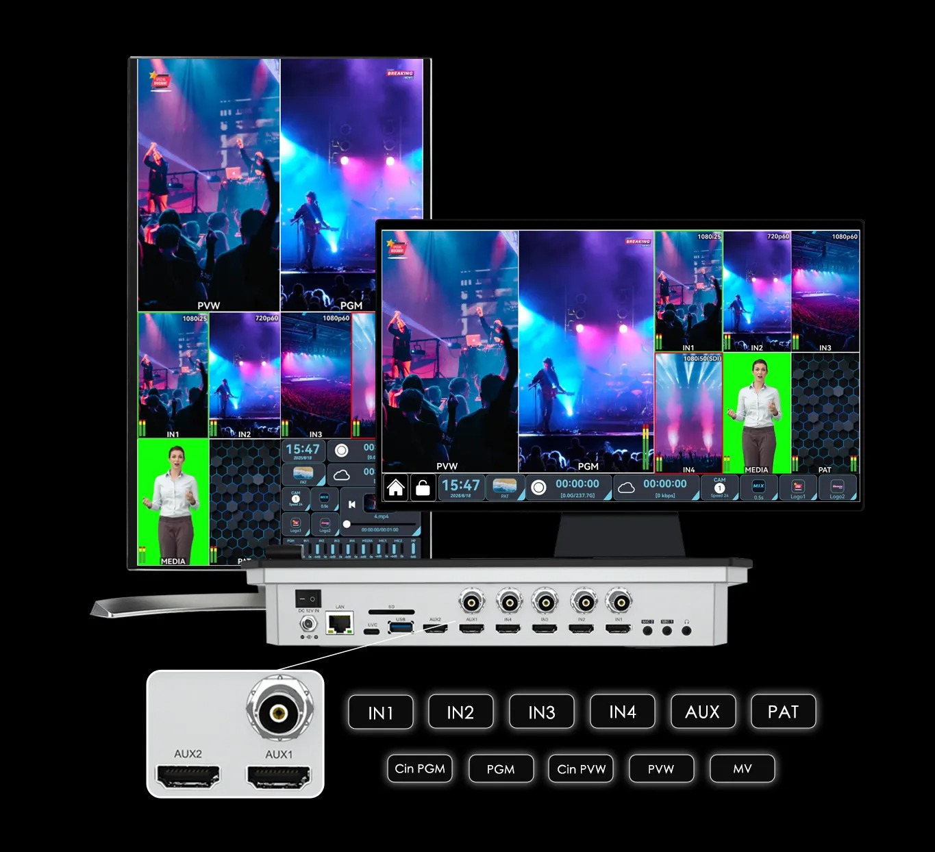 Thiết bị hỗ trợ cả chế độ ngang và dọc cho chế độ xem trước và phát trực tiếp, cho phép người dùng thích ứng liền mạch với các nền tảng và định dạng nội dung khác nhau. Dù phát trực tiếp trên các nền tảng ưu tiên thiết bị di động như TikTok hay các nền tảng 16:9 truyền thống như YouTube, việc chuyển đổi chế độ đều nhanh chóng và dễ dàng. Điểm thực sự tạo nên sự khác biệt của Touch-S chính là thiết kế đầu ra đa năng — bao gồm một cổng SDI và hai cổng HDMI AUX. Các đầu ra này có thể tùy chỉnh hoàn toàn, cho phép người dùng gán bất kỳ nguồn video nào cho bất kỳ đầu ra nào, chẳng hạn như các kênh đầu vào riêng lẻ, bố cục đa chế độ xem, tín hiệu PGM (chương trình) rõ ràng hoặc xem trước bốn chế độ xem. Mức độ linh hoạt đầu ra này lý tưởng cho các quy trình làm việc trực tiếp phức tạp, giám sát phòng thu và thiết lập nhiều màn hình.