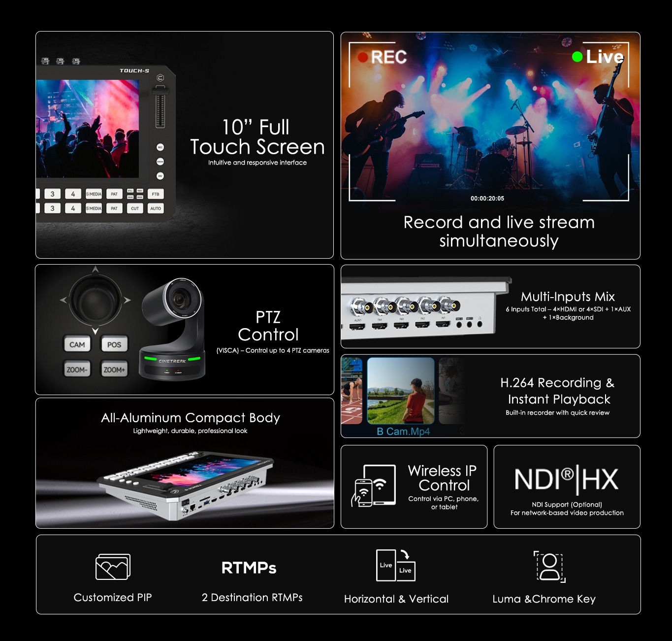 Cinetreak Touch S sở hữu màn hình cảm ứng toàn phần 10 inch cho khả năng điều khiển trực quan, nằm gọn trong thân máy nhôm nguyên khối nhỏ gọn, thanh mảnh. Với hỗ trợ 6 đầu vào (4 HDMI hoặc 4 SDI, cùng với AUX và Background), đầu ra PGM/PVW độc lập và tự động trộn đầu vào, bàn trộn tín hiệu Touch-S xử lý việc chuyển đổi phức tạp một cách dễ dàng. Thiết bị cung cấp khả năng ghi hình H.264 với khả năng phát lại tức thì, phát trực tuyến RTMP kép và điều khiển camera PTZ tích hợp (tối đa 4 camera qua VISCA). Điều khiển IP không dây qua PC, điện thoại hoặc máy tính bảng cho phép vận hành từ xa, trong khi các tính năng mạnh mẽ như bố cục PIP/POP tùy chỉnh, khóa sắc độ và độ sáng, chế độ chân dung/phong cảnh và hỗ trợ NDI|HX tùy chọn giúp Touch-S trở thành giải pháp sản xuất linh hoạt và toàn diện cho các nhà sáng tạo Creator, nhà sản xuất và chuyên gia Pro AV.