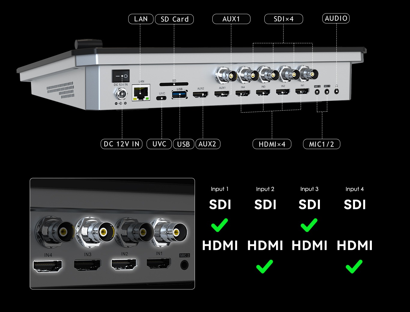 - Đầu vào video: HDMI IN × 4 SDI IN × 4 USB × 1