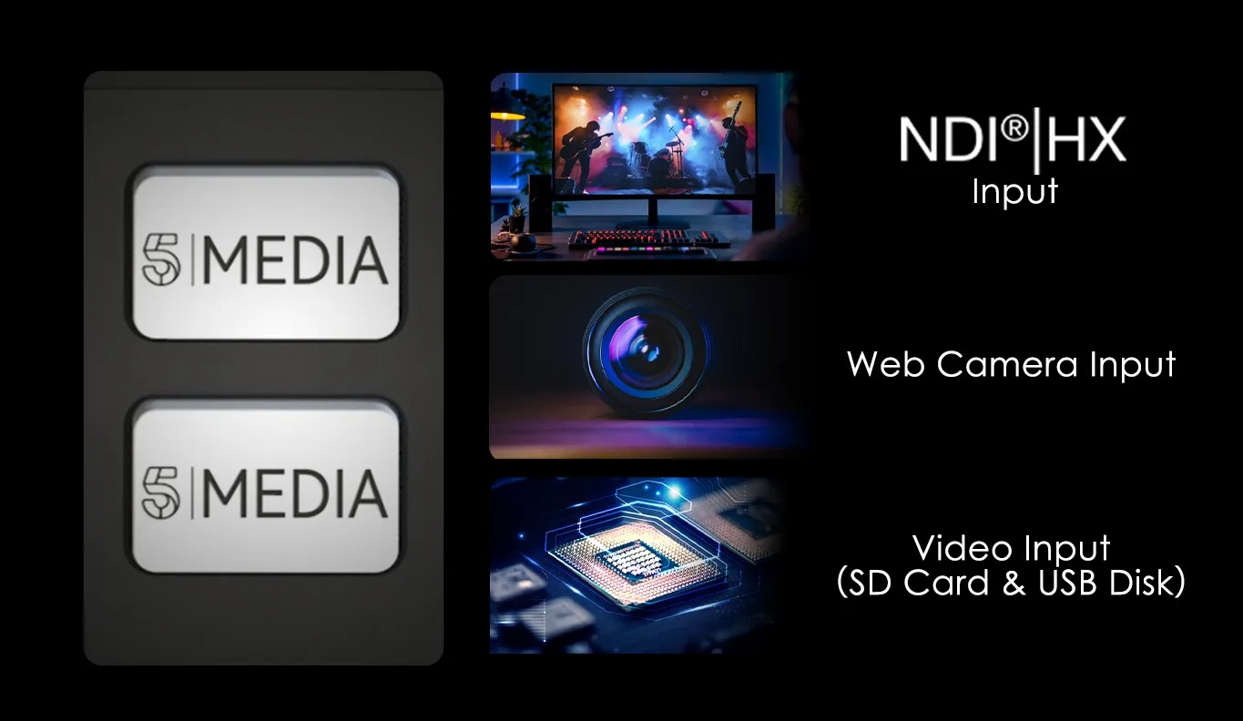 Ngoài các đầu vào phần cứng, Touch-S còn sở hữu một kênh đa phương tiện mạnh mẽ dựa trên phần mềm, hoạt động như nguồn đầu vào thứ năm. Kênh này hỗ trợ nhiều loại đầu vào đa phương tiện bên ngoài, bao gồm luồng mạng (qua URL), nguồn NDI, webcam USB và các thiết bị như DJI Pocket 3. Người dùng cũng có thể nhập tệp video trực tiếp từ thẻ SD, SSD hoặc ổ USB, giúp dễ dàng tích hợp nội dung đã ghi sẵn vào các chương trình phát sóng trực tiếp. Đầu vào đa phương tiện linh hoạt này giúp tăng cường đáng kể tính linh hoạt của bộ chuyển đổi trong các tình huống phát trực tuyến và phát sóng khác nhau.