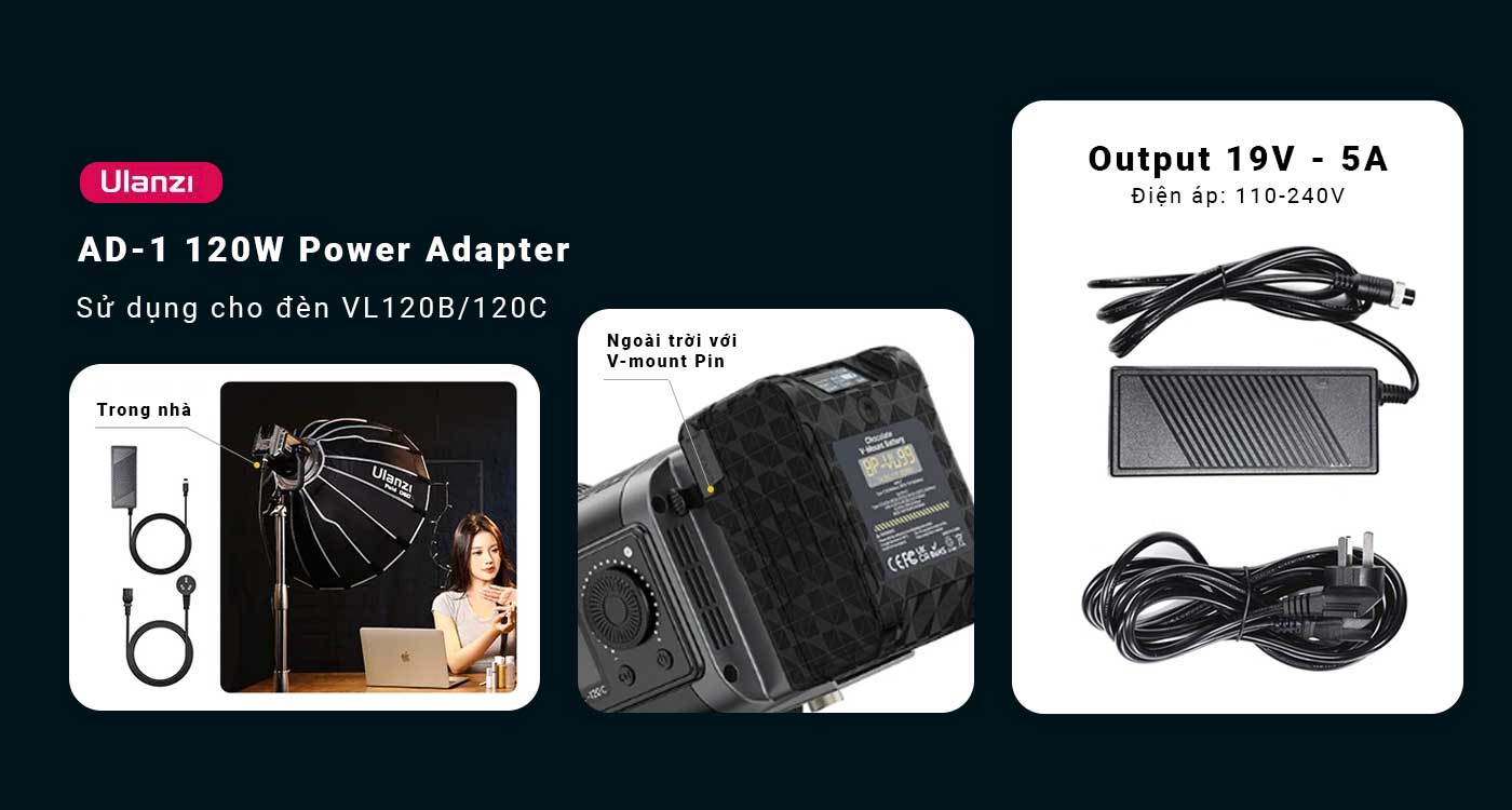 - Ulanzi AD-1 là Nguồn DC Adapter cho hệ đèn V-Mount Light Ulanzi VL120B/VL120C khi bạn sử dụng In-House