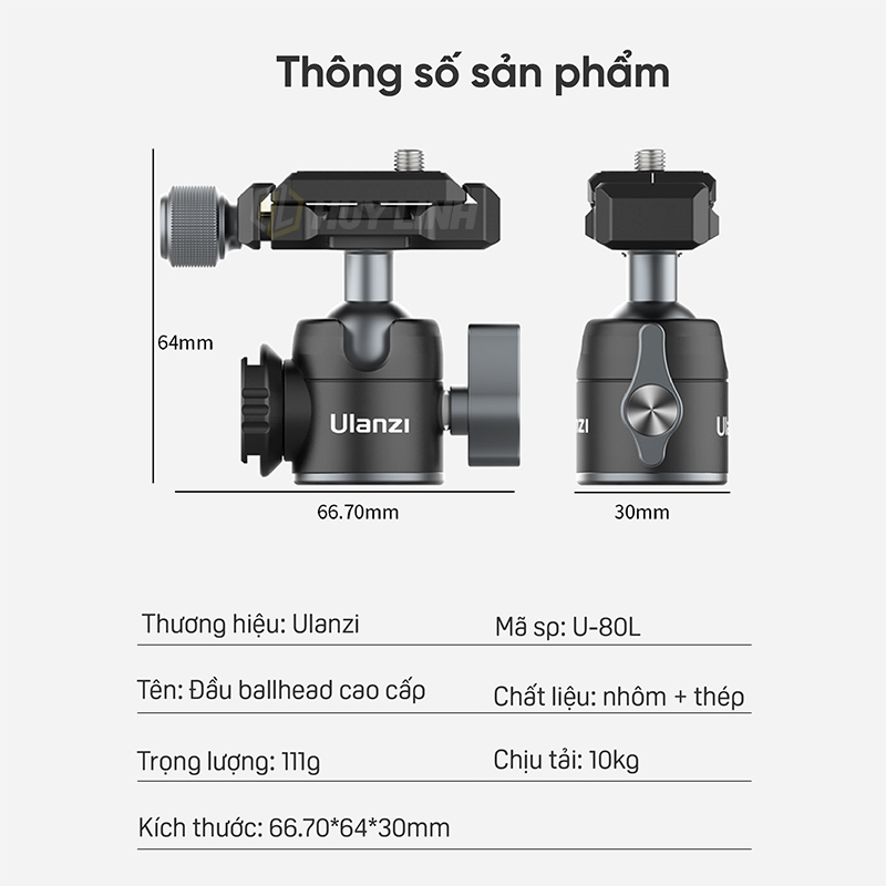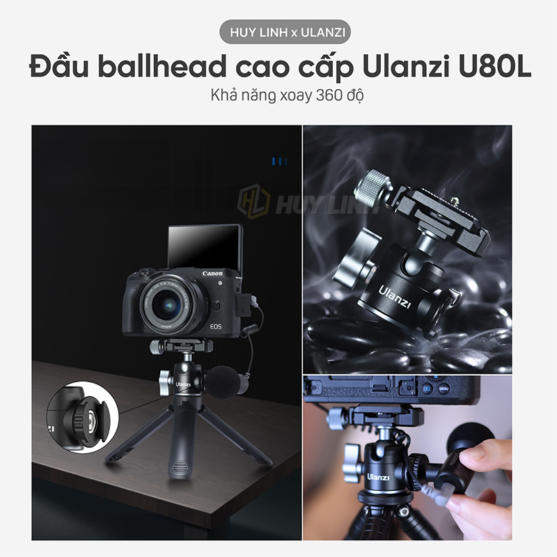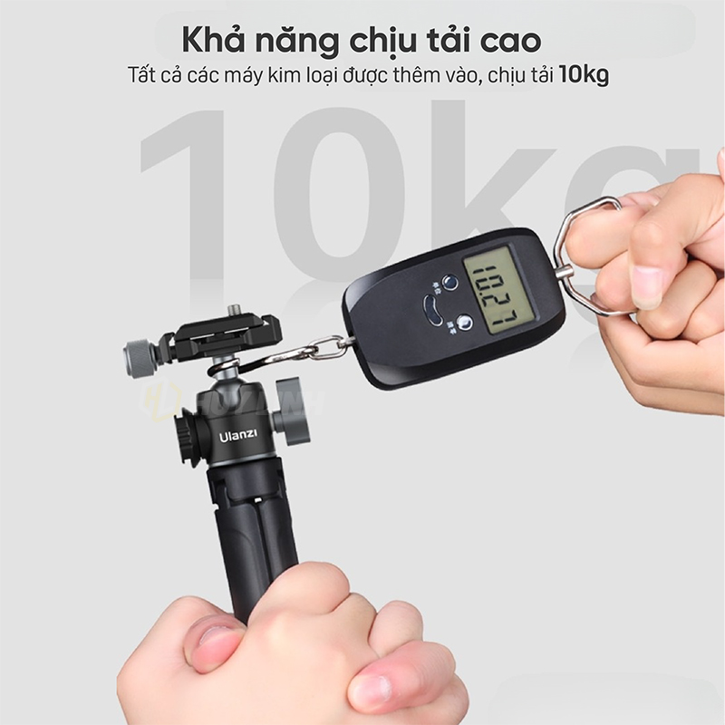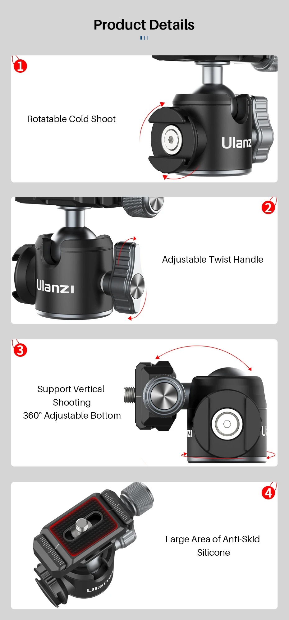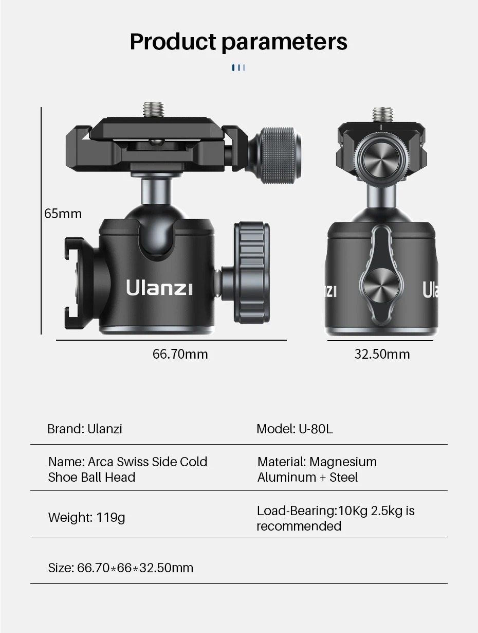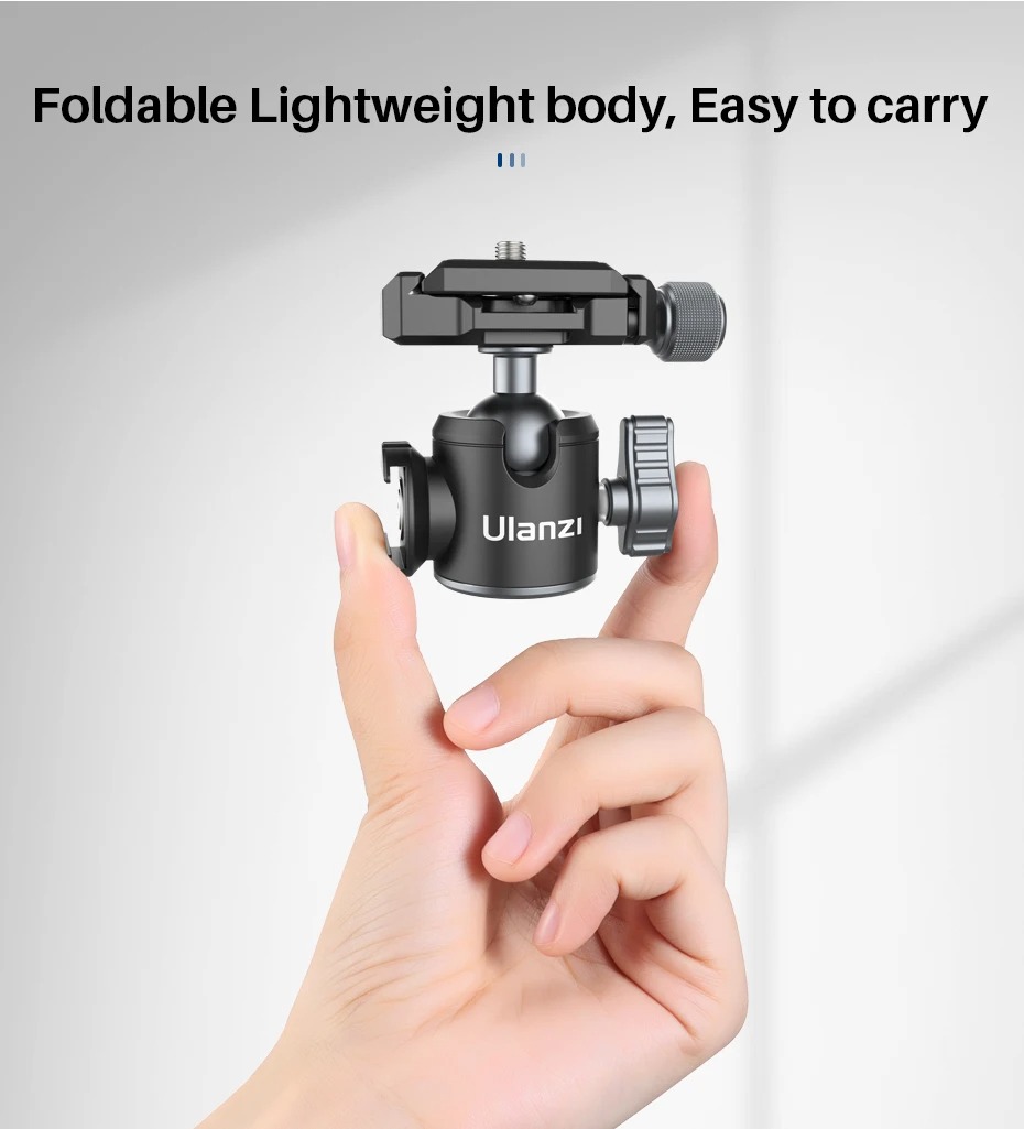 - Đầu ballhead ULANZI U-80L có trọng lượng chỉ 119g, nhưng khả năng tải 10kg/22lbs. Đầu ballhead xoay 360 độ có thể điều chỉnh ngang/dọc/bên, đặt máy ảnh ở mọi góc độ.