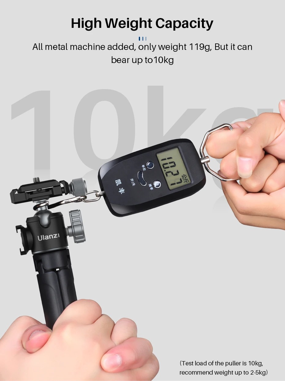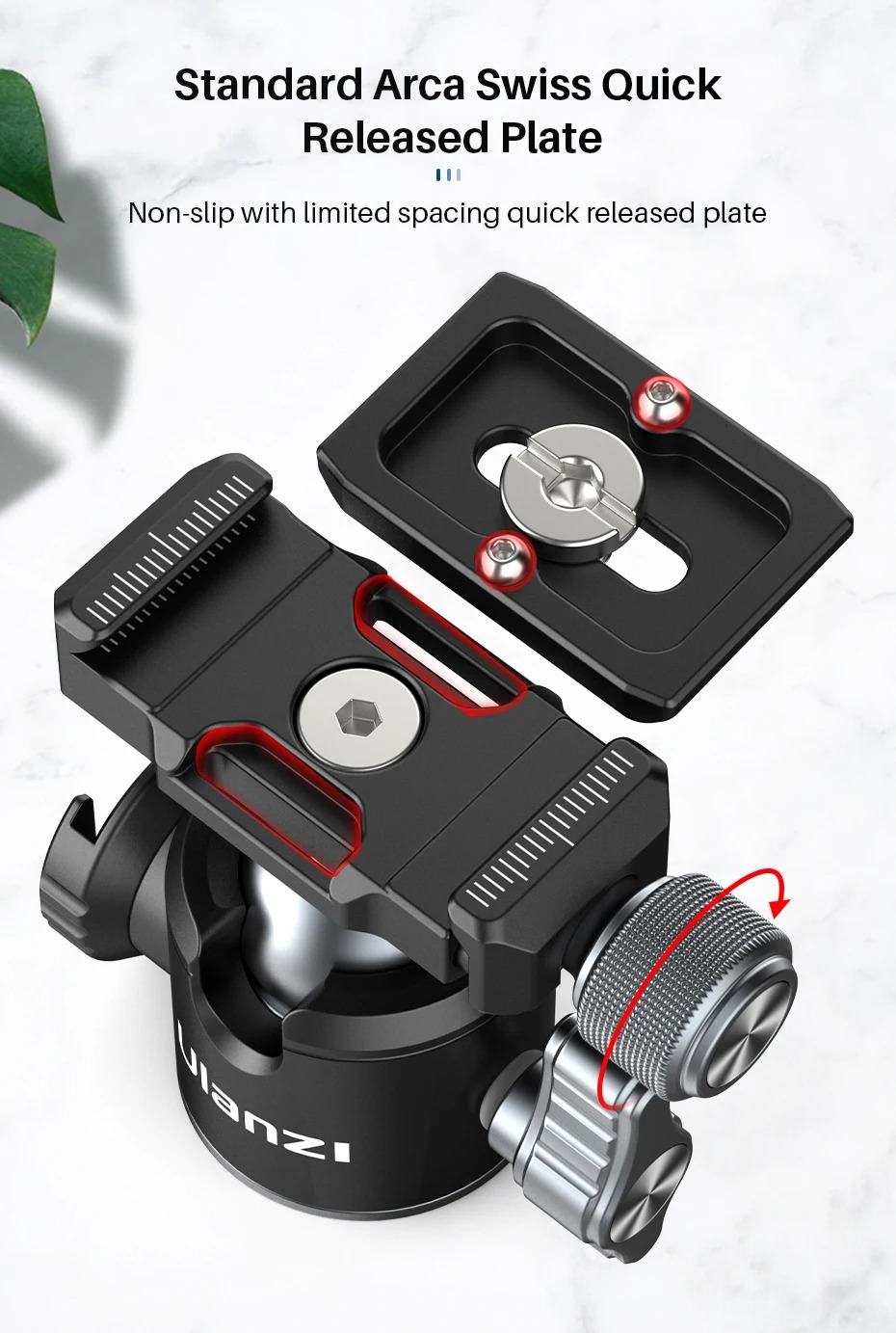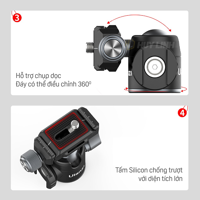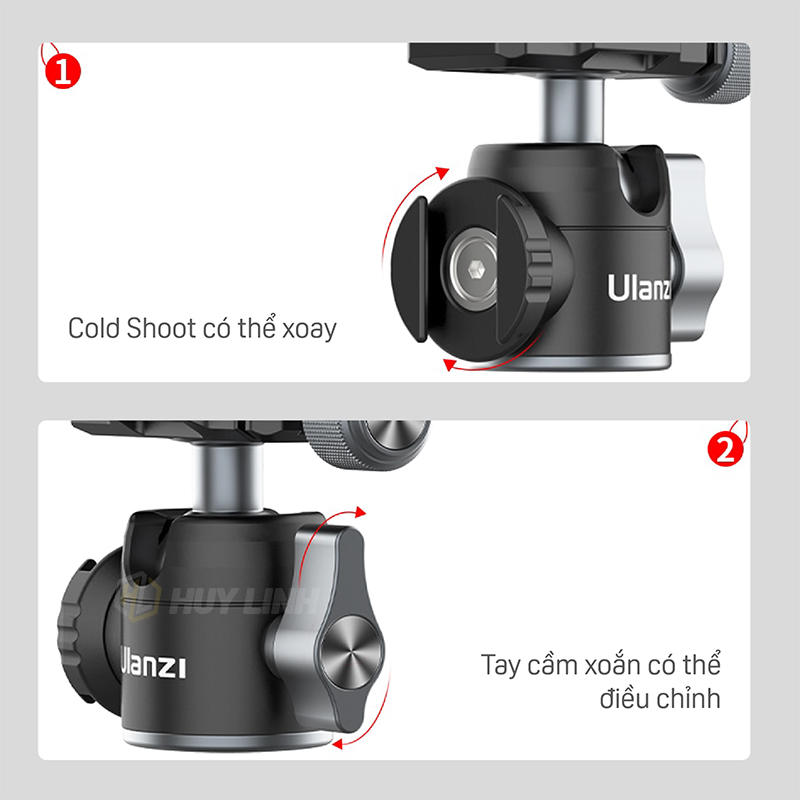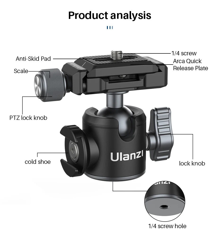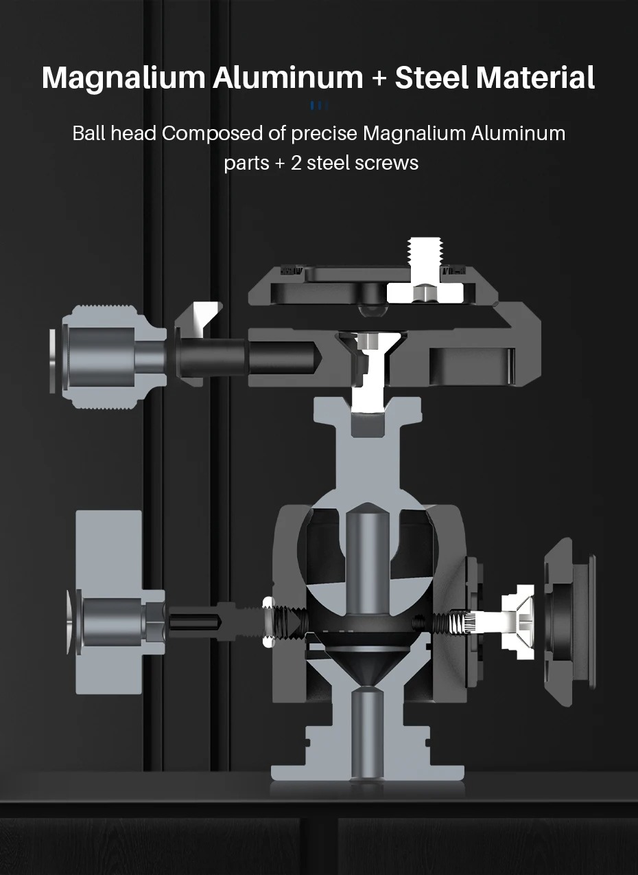 - Đầu ballhead ULANZI U-80L có trọng lượng chỉ 119g, nhưng khả năng tải 10kg/22lbs. Đầu ballhead xoay 360 độ có thể điều chỉnh ngang/dọc/bên, đặt máy ảnh ở mọi góc độ.