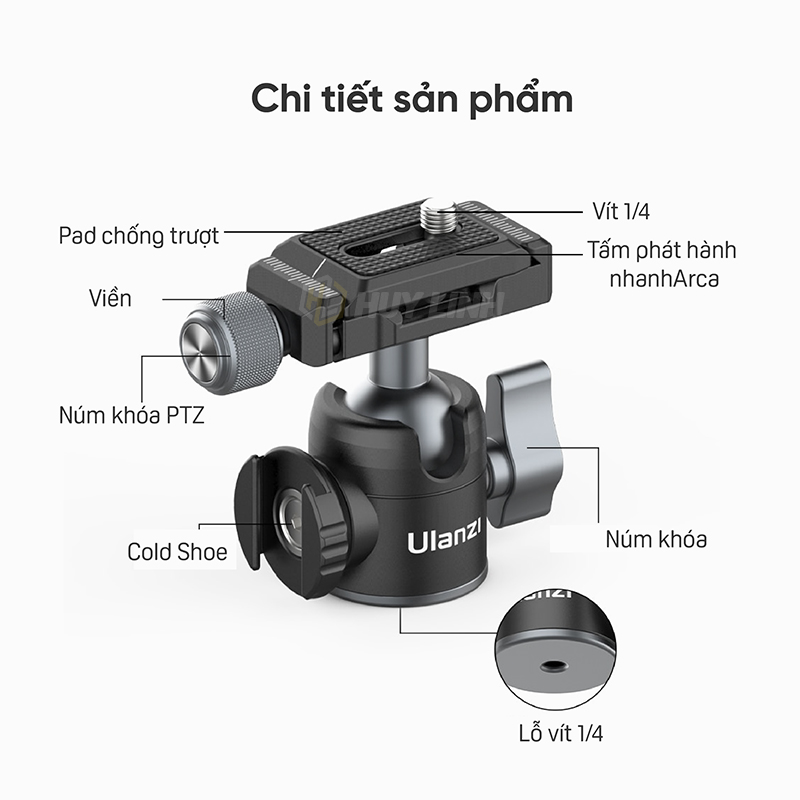 - Gia công CNC hoàn toàn bằng kim loại, đầu bi lõi cứng chịu tải 10kg, mang hầu hết các máy ảnh. Đường kính 32,5mm được thiết kế, tương thích với hầu hết các chân máy có giao diện 1/4" trên thị trường.