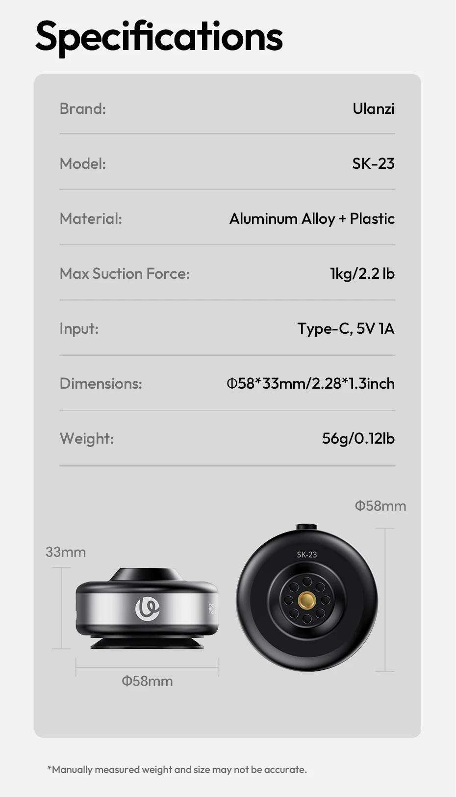 - Kích thước: Ø58*33mm/2.28*1.3inch