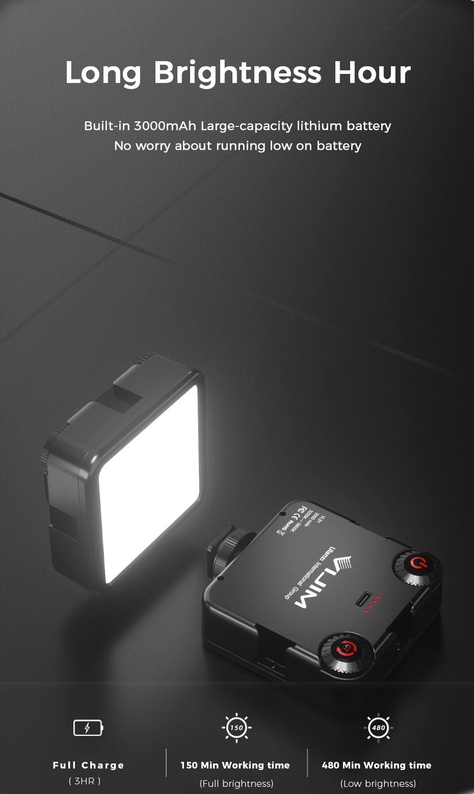 - Đèn VIJIM VL81 tích hợp pin lithium dung lượng lớn 3000mAh mà không lo không đủ năng lượng khi quay.