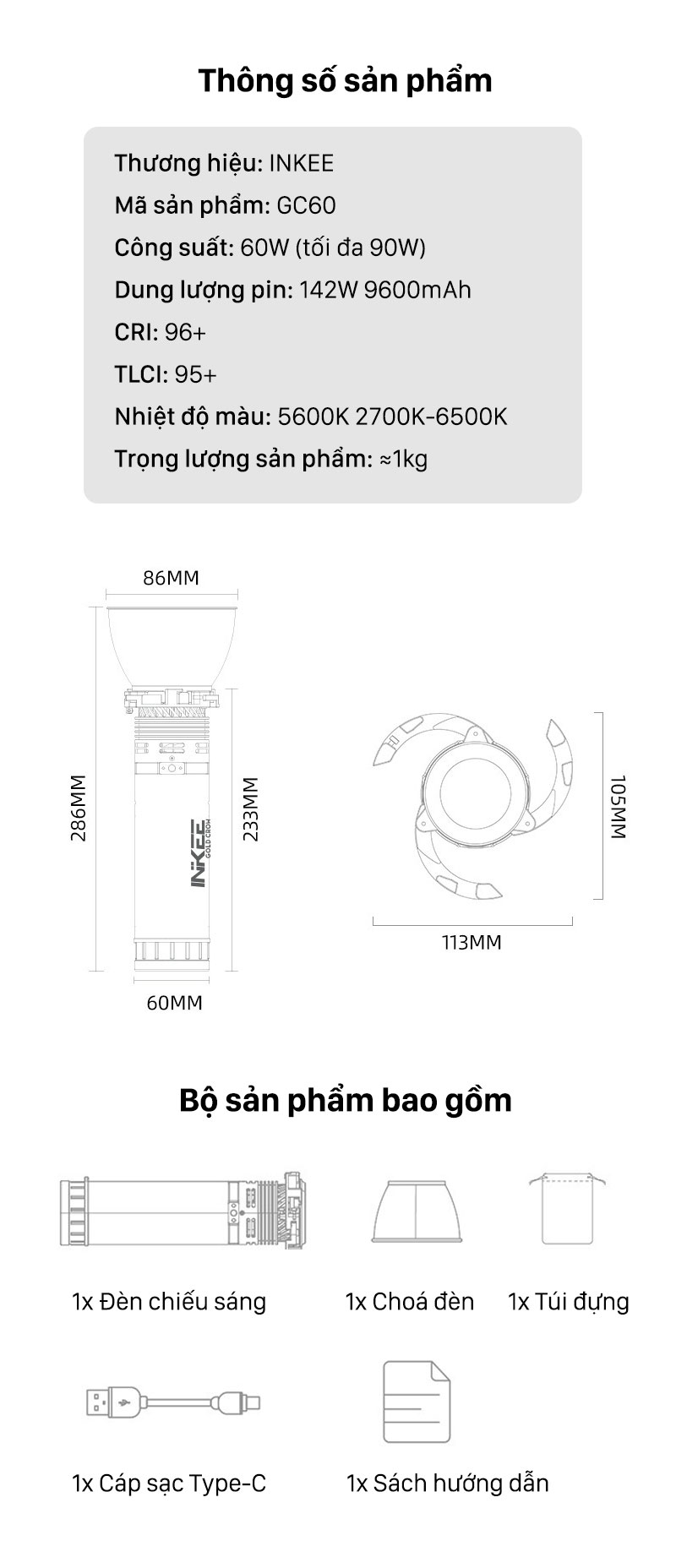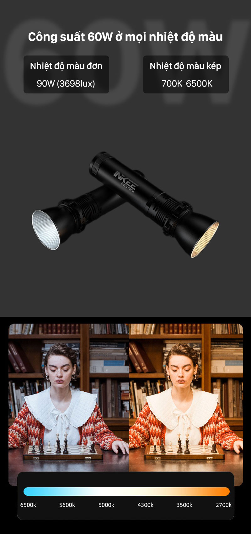 - Công suất 60W: Nhiệt độ màu đơn (90W) & nhiệt độ màu kép (2700K-6500K).