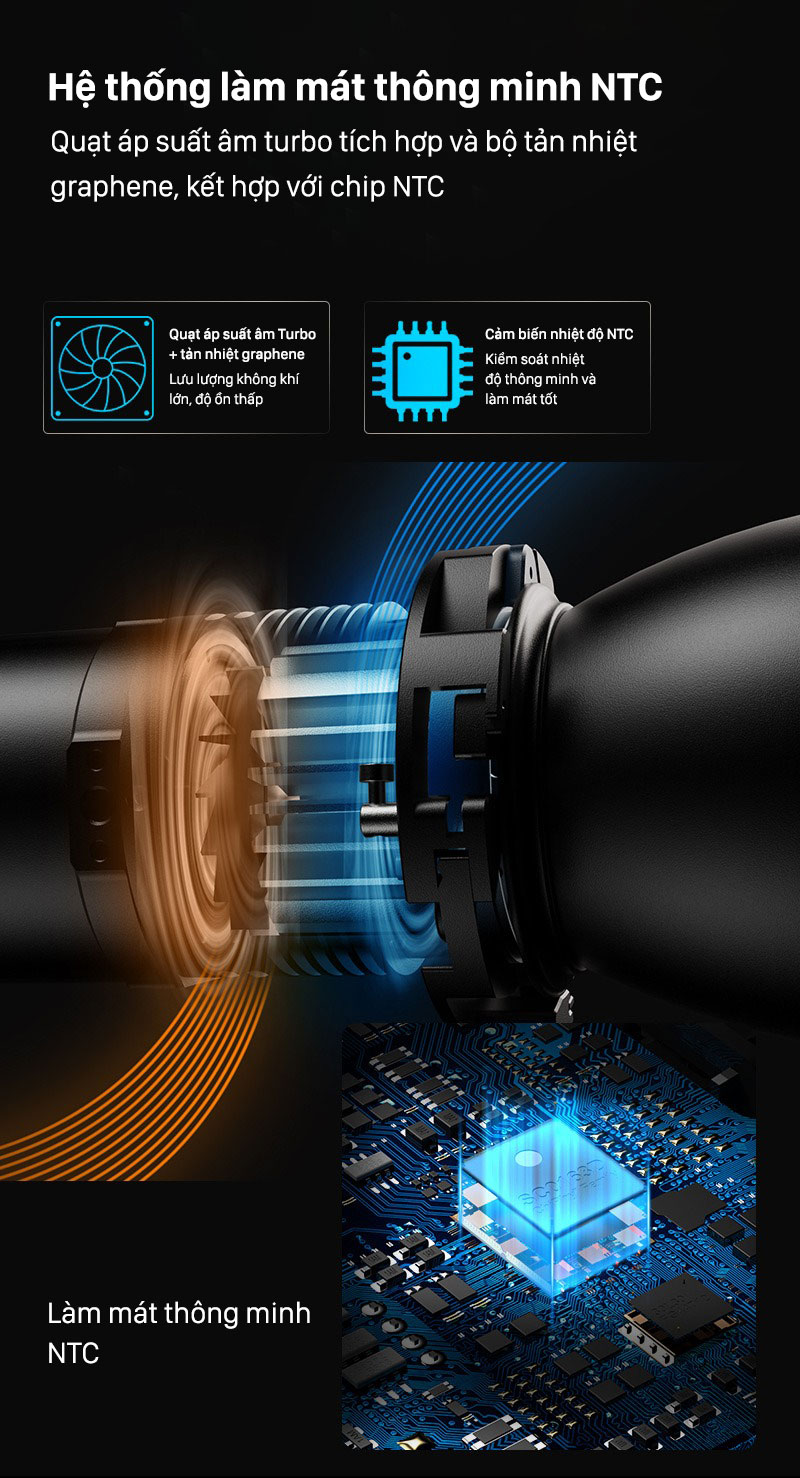 - Hệ thống làm mát NTC: Quạt áp suất âm Turbo + tản nhiệt graphene.