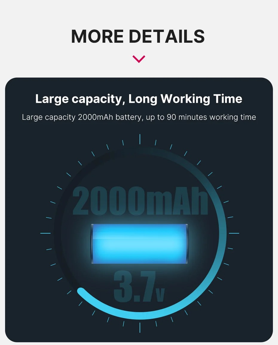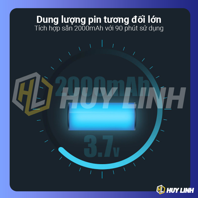 - Dung lượng pin tích hợp: 2000Mah (Tương đương 90 phút sử dụng)